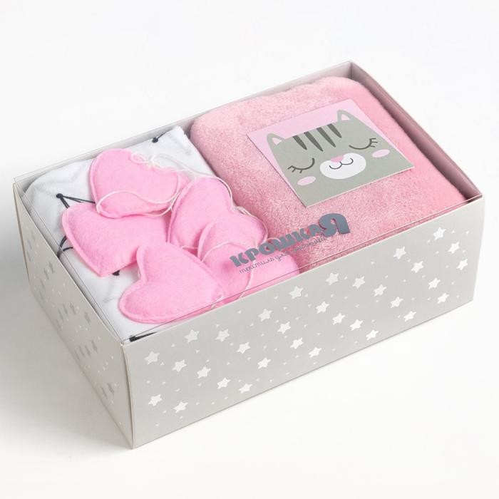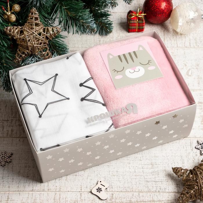В набор входит плед 90 × 90 см и муслиновая пелёнка 75 × 120 см.