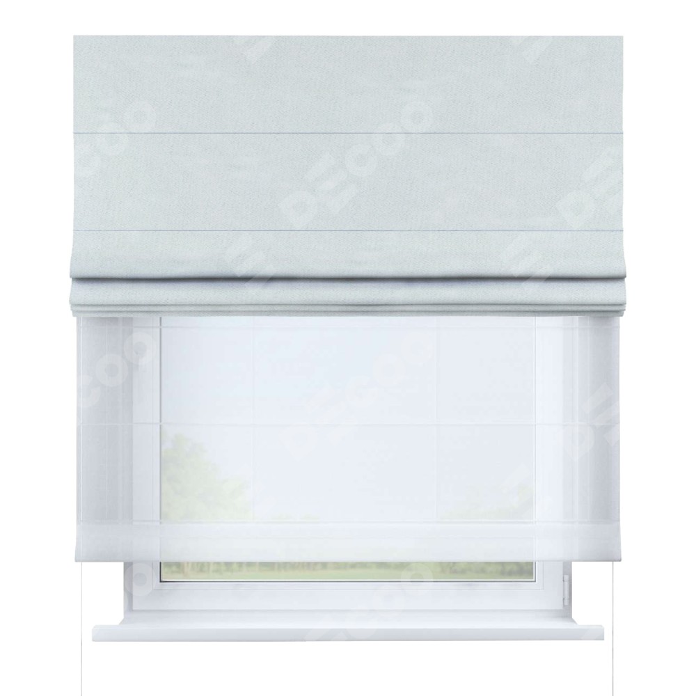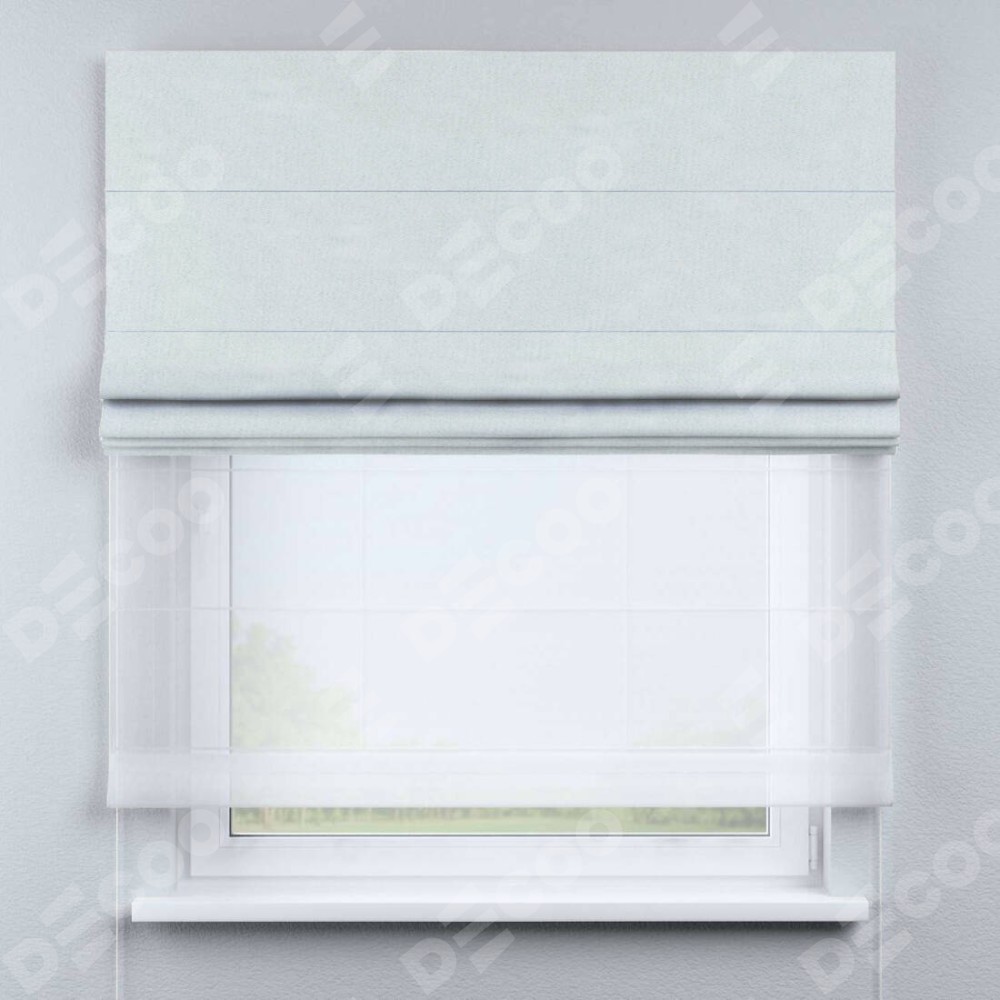 Римская штора день-ночь производителя «Cortin», используется для проёма, пошита из двух полотен, с лицевой стороны блэкаут однотонный дымчато-молочный артикул 88282, вторая ткань тюль (по стандарту комплектуется тюль белого цвета артикул V-01). Имеет универсальный механизм и подходит для монтажа: на потолок, на стену и в нишу.