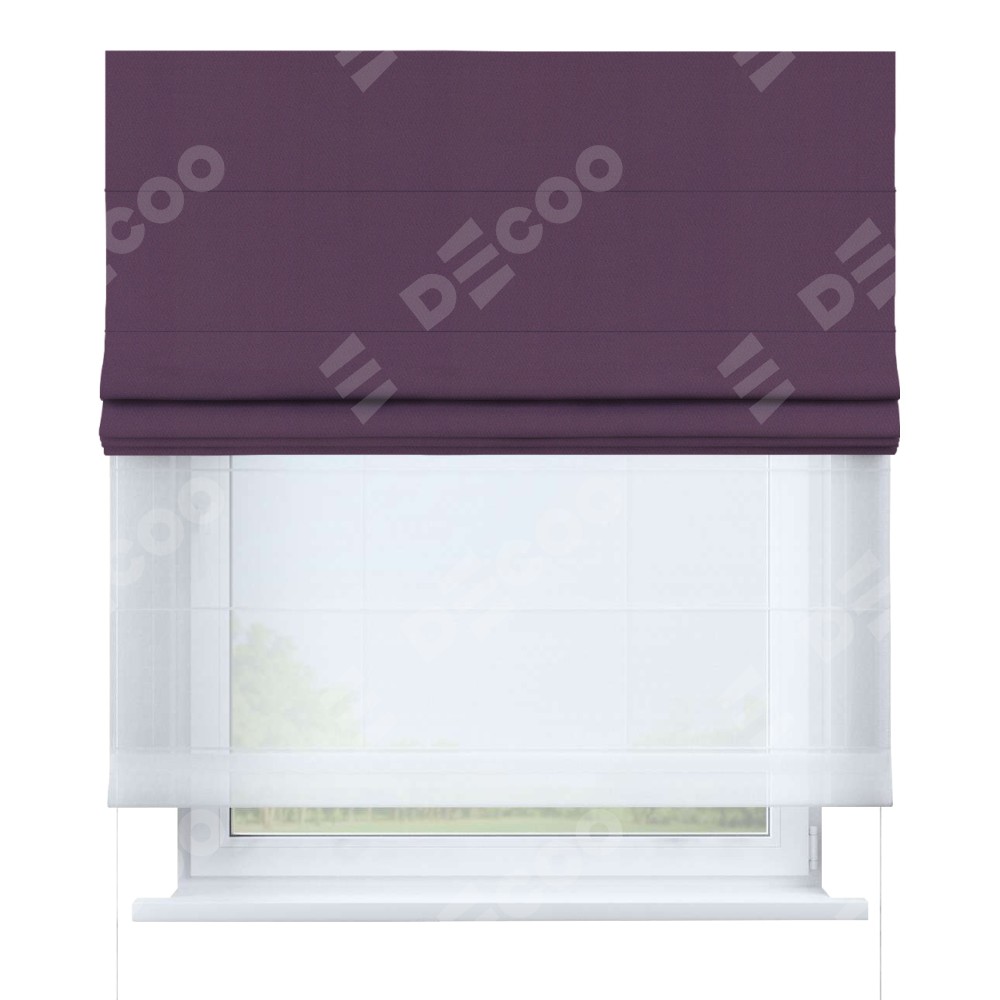 Римская штора день-ночь производителя «Cortin», используется для проёма, пошита из двух полотен, с лицевой стороны блэкаут однотонный фуксия артикул 88303, вторая ткань тюль (по стандарту комплектуется тюль белого цвета артикул V-01). Имеет универсальный механизм и подходит для монтажа: на потолок, на стену и в нишу.