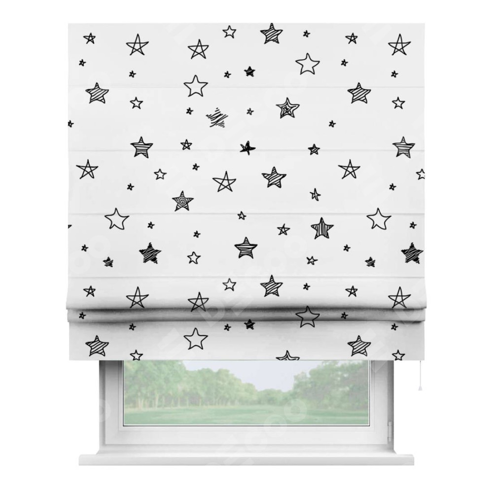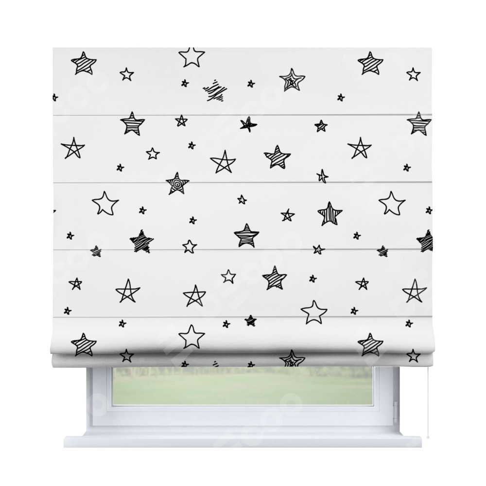 Римская штора производителя «Cortin», используется для проёма, пошита из ткани блэкаут с нанесением сублимационной печати «Звёзды». Имеет универсальный механизм и подходит для монтажа: на потолок, на стену и в нишу.