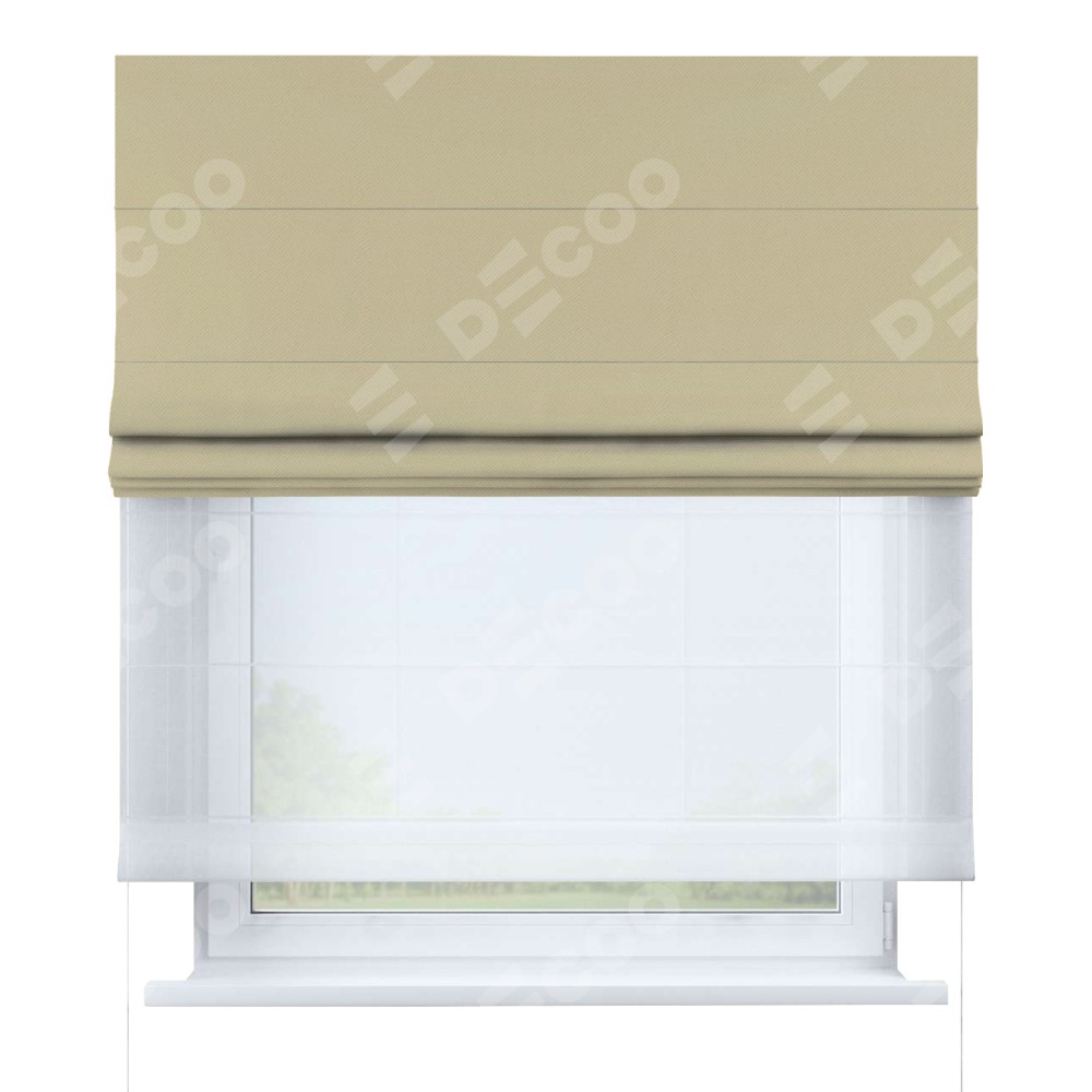 Римская штора день-ночь производителя «Cortin», используется для проёма, пошита из двух полотен, с лицевой стороны блэкаут однотонный кофейный артикул 13130, вторая ткань тюль (по стандарту комплектуется тюль белого цвета артикул V-01). Имеет универсальный механизм и подходит для монтажа: на потолок, на стену и в нишу.