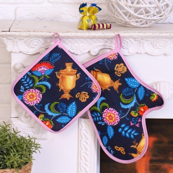 Набор кухонный (Варежка 26*30 см+прихватка 18*18 см) Самовары, синий, рогожка, хл 100%
