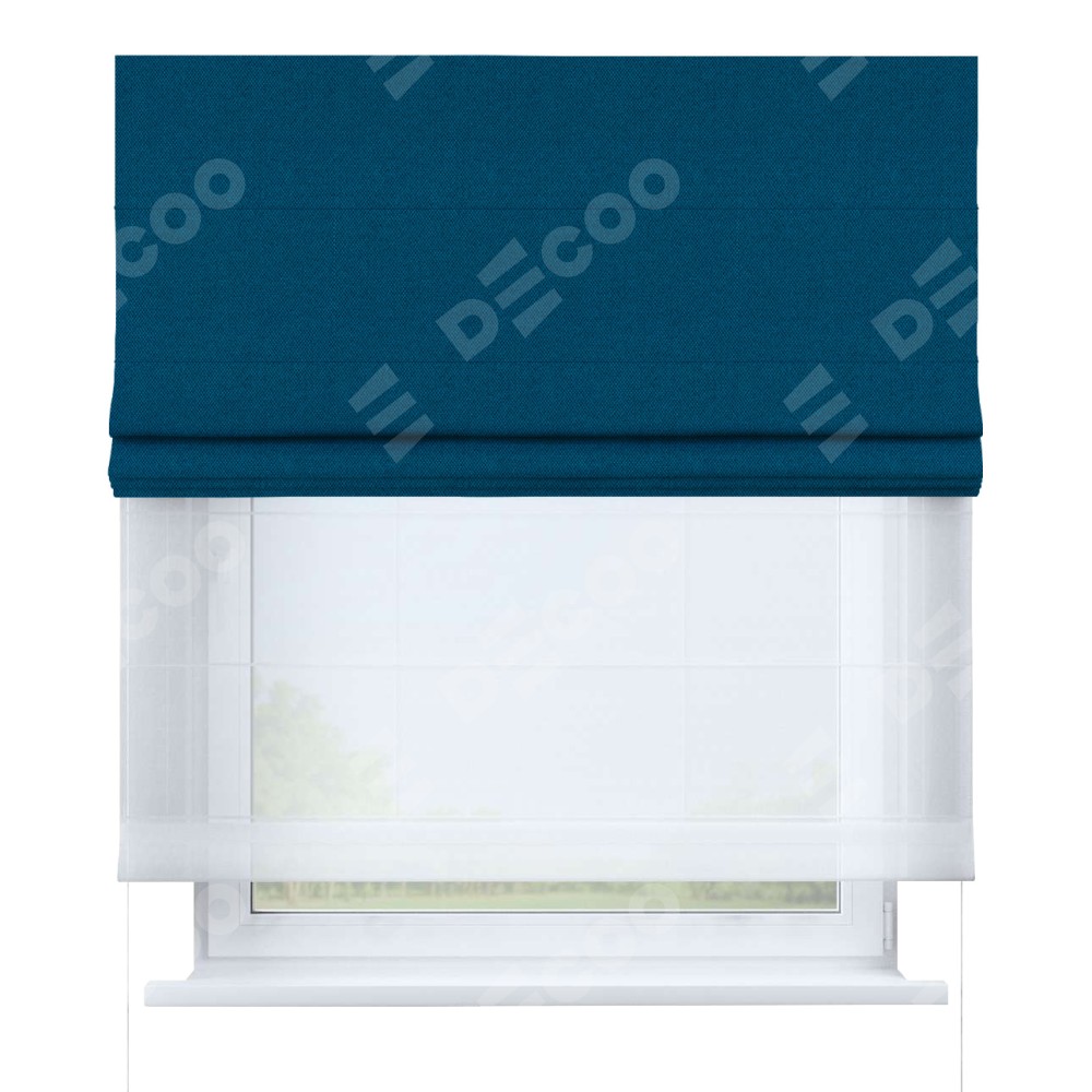 Римская штора день-ночь производителя «Cortin», используется для проёма, пошита из двух полотен, с лицевой стороны лён димаут синий артикул 16260, вторая ткань тюль (по стандарту комплектуется тюль белого цвета артикул V-01). Имеет универсальный механизм и подходит для монтажа: на потолок, на стену и в нишу.