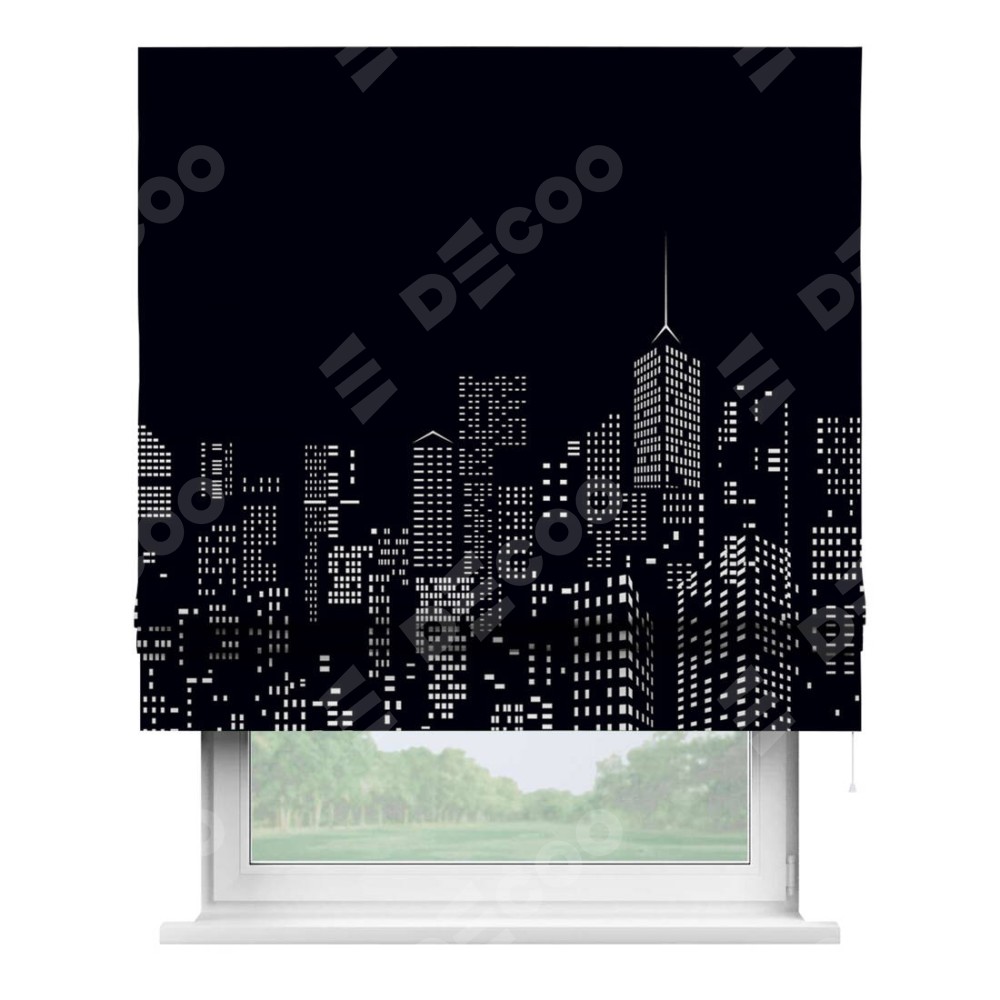 Римская штора производителя «Cortin», используется для проёма, пошита из ткани блэкаут с нанесением сублимационной печати «Ночной город». Имеет универсальный механизм и подходит для монтажа: на потолок, на стену и в нишу.