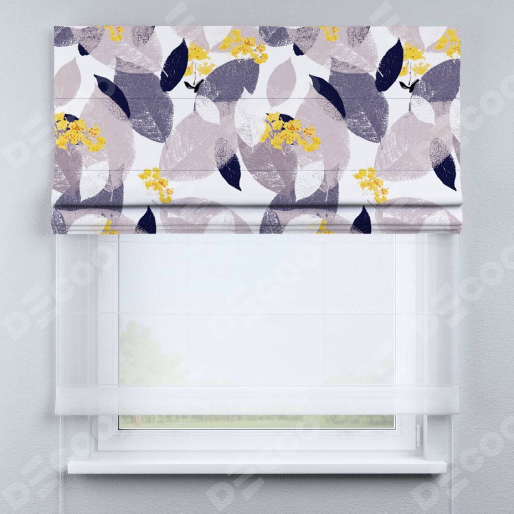 Римская штора день-ночь производителя «Cortin», используется для проёма, пошита из двух полотен, с лицевой блэкаут с нанесением сублимационной печати «Листопад», вторая ткань тюль (по стандарту комплектуется тюль белого цвета артикул V-01). Имеет универсальный механизм и подходит для монтажа: на потолок, на стену и в нишу.
