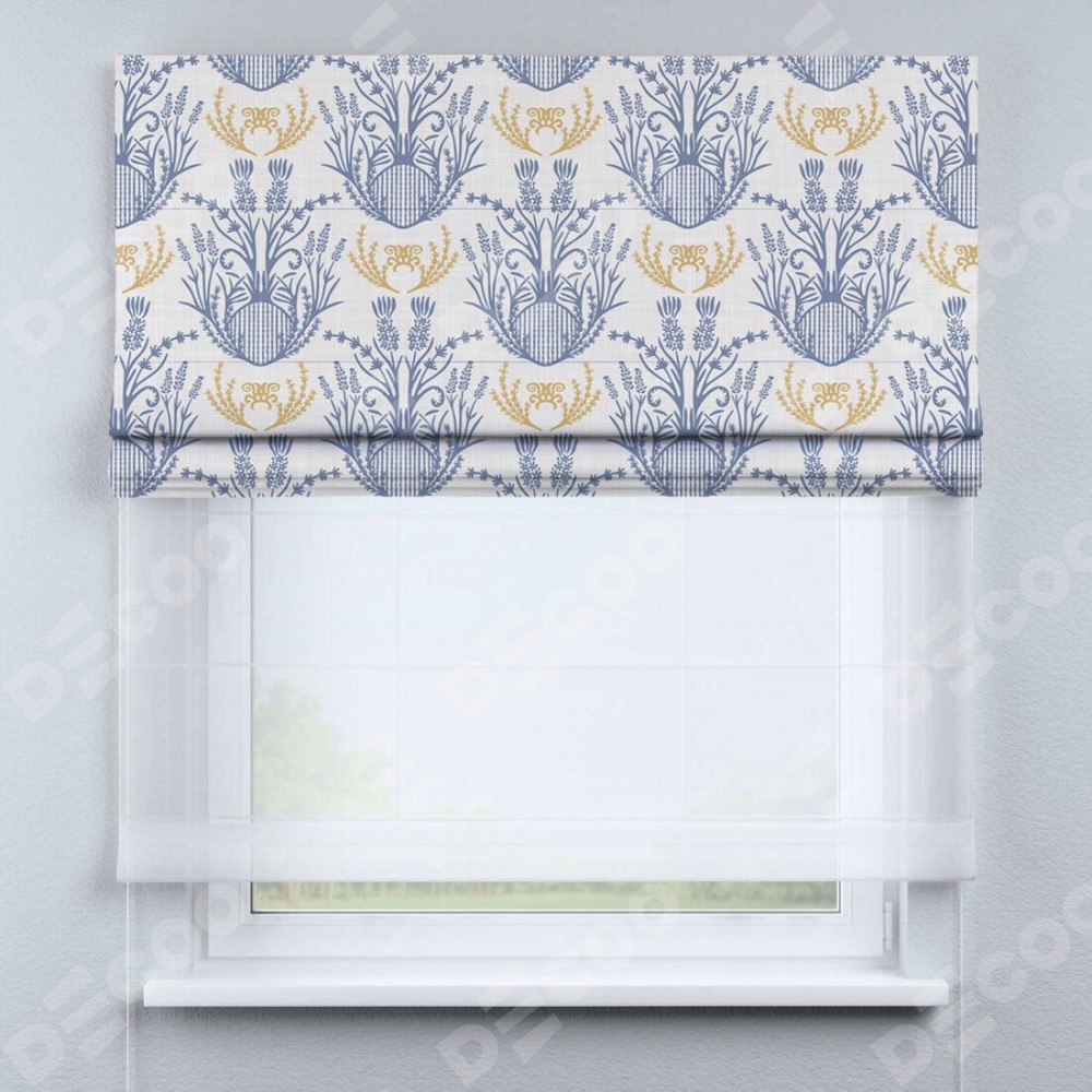 Римская штора день-ночь производителя «Cortin», используется для проёма, пошита из двух полотен, с лицевой блэкаут с нанесением сублимационной печати «Шикарная лаванда», вторая ткань тюль (по стандарту комплектуется тюль белого цвета артикул V-01). Имеет универсальный механизм и подходит для монтажа: на потолок, на стену и в нишу.