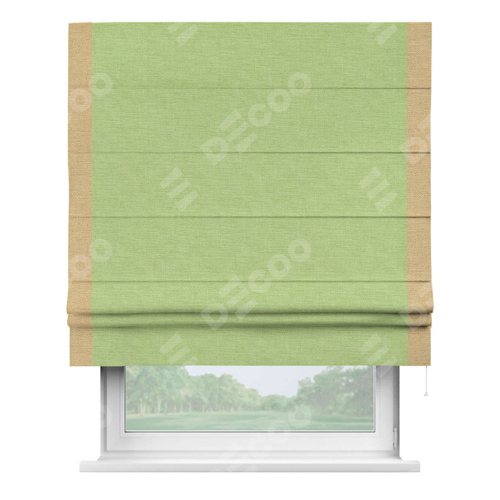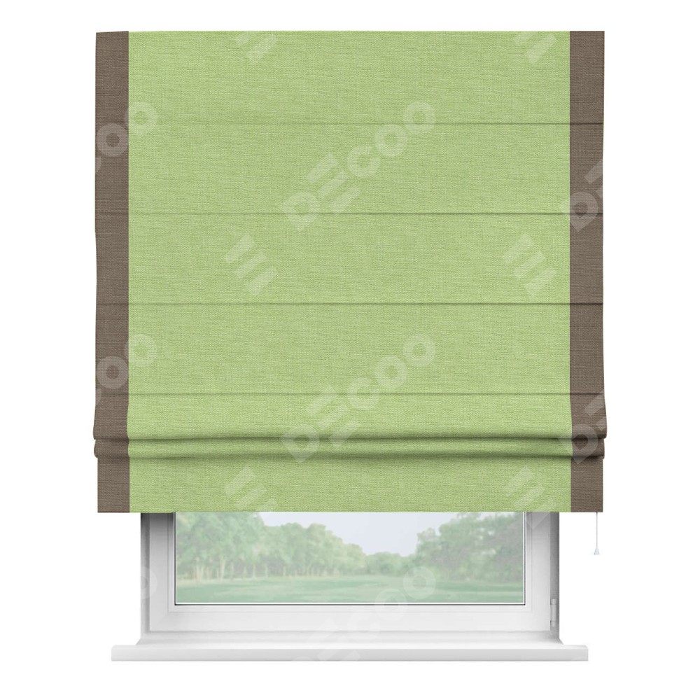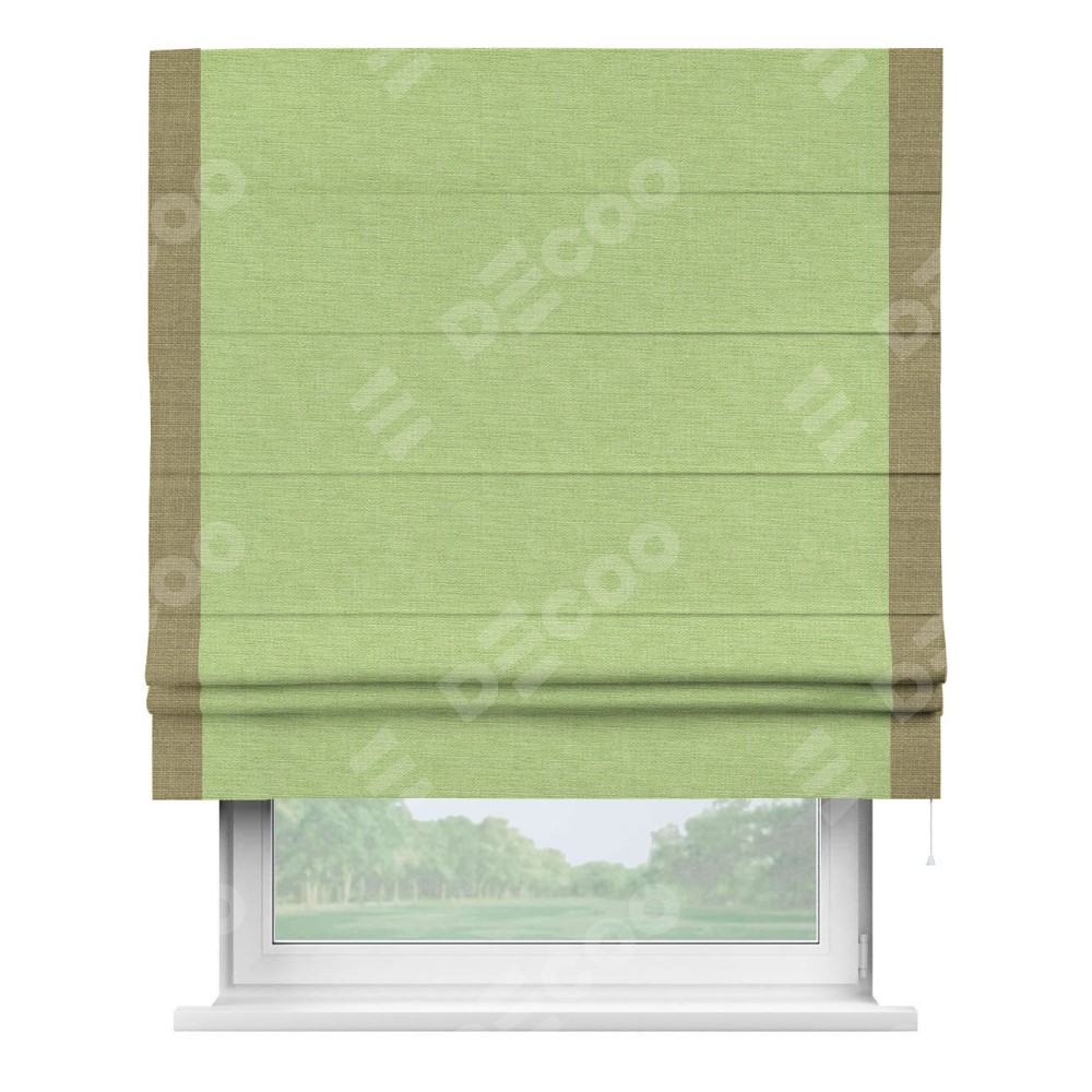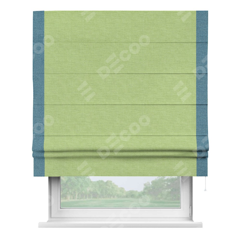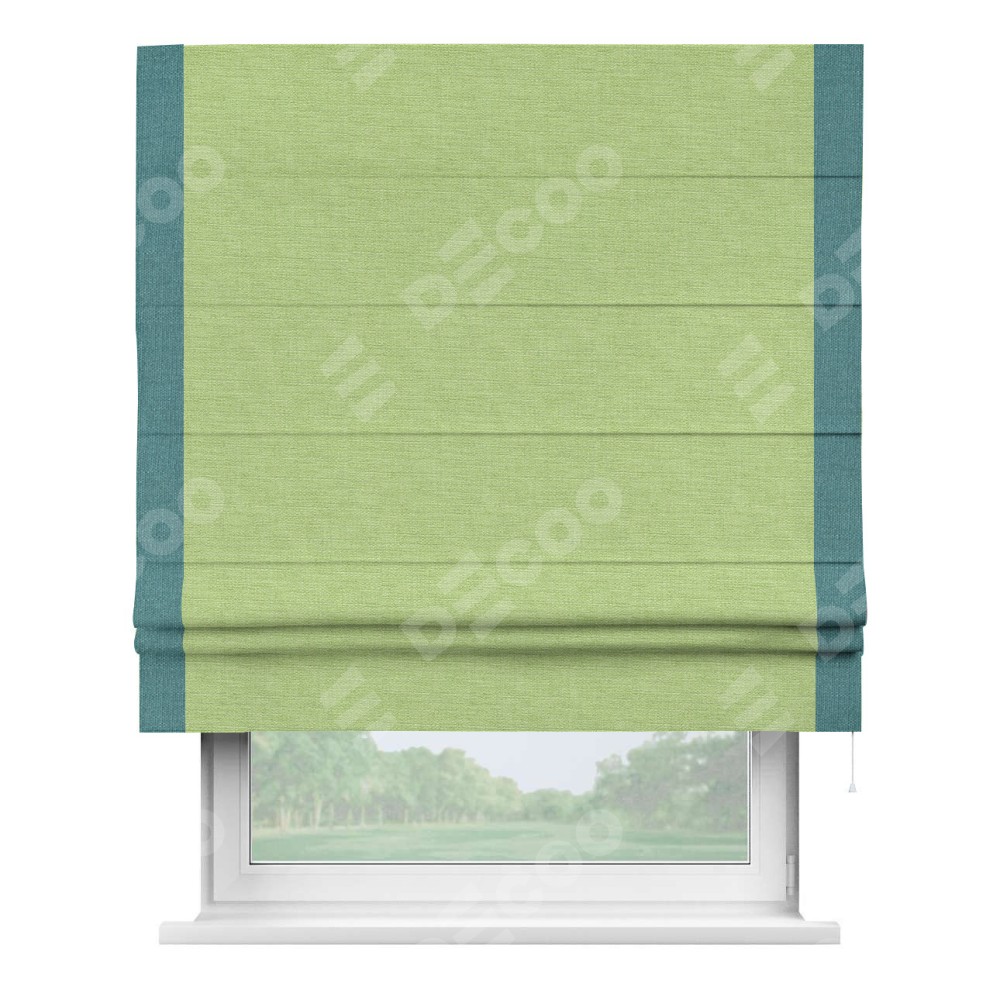 Римская штора производителя «Cortin», используется для проёма, пошита из ткани лён зеленый, артикул 85906. Отделка шторы кантом «Стрим Дуо», ткань для канта используется из льна разной расцветки на выбор. Имеет универсальный механизм и подходит для монтажа: на потолок, на стену и в нишу.