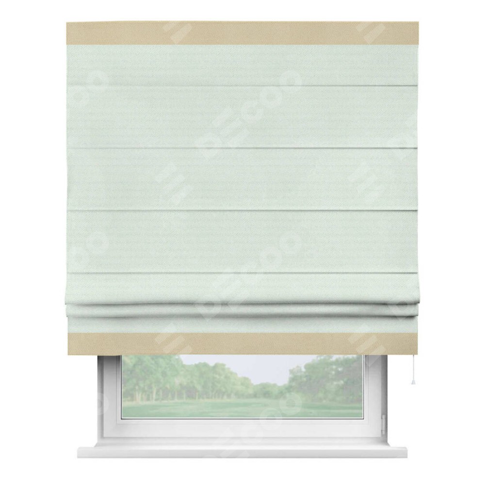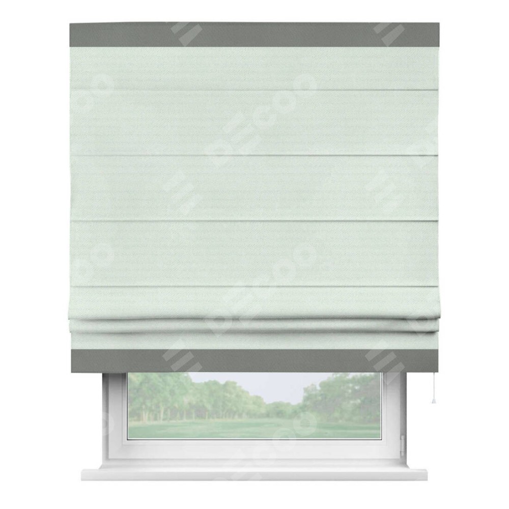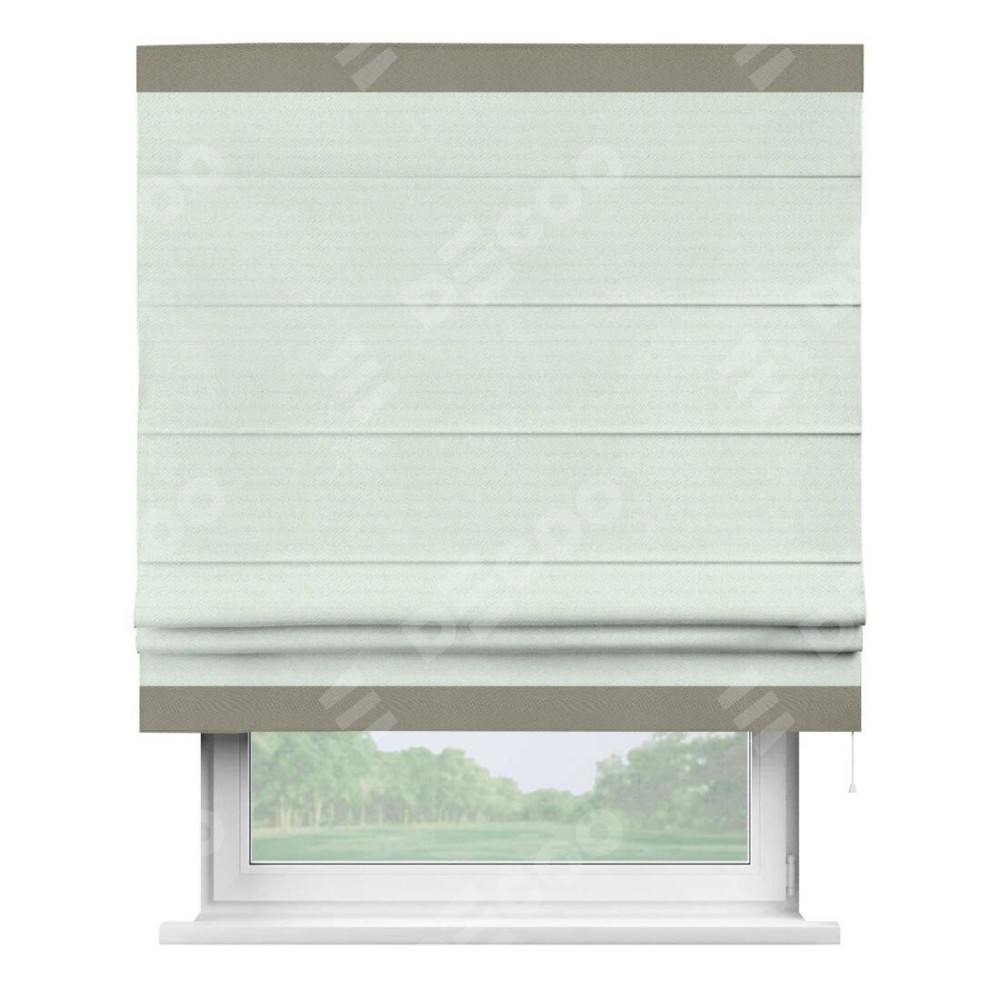 Римская штора производителя «Cortin», используется для проёма, пошита из ткани блэкаут однотонный дымчато-молочный, артикул ткани 88282. Отделка шторы кантом «Горизонт», ткань для канта используется из блэкаута однотонного разной расцветки на выбор. Имеет универсальный механизм и подходит для монтажа: на потолок, на стену и в нишу.
