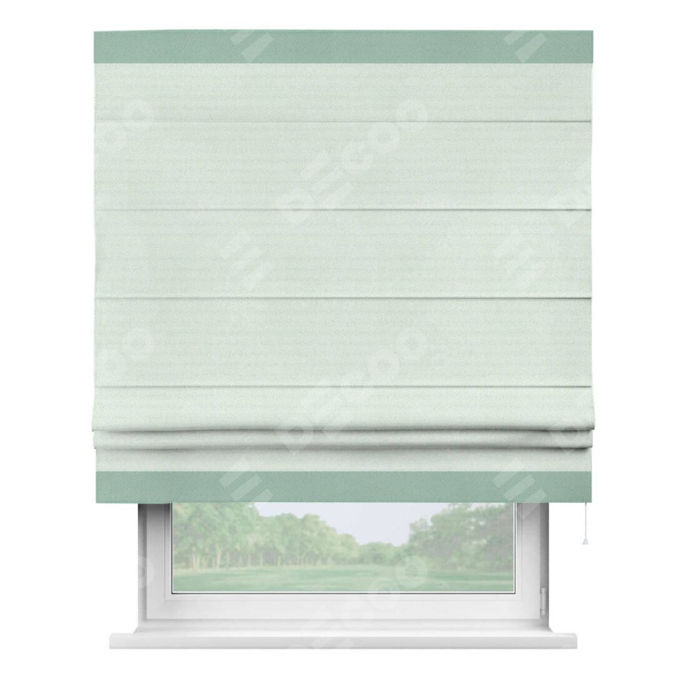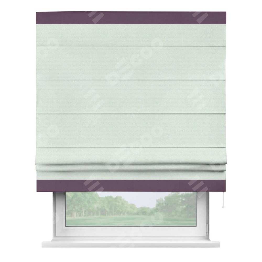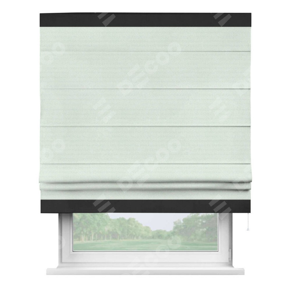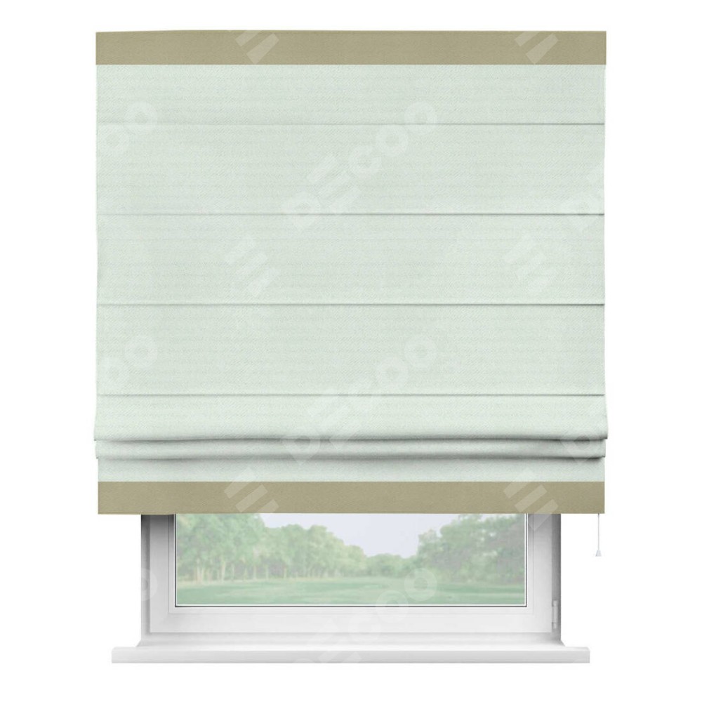 Римская штора производителя «Cortin», используется для проёма, пошита из ткани блэкаут однотонный дымчато-молочный, артикул ткани 88282. Отделка шторы кантом «Горизонт», ткань для канта используется из блэкаута однотонного разной расцветки на выбор. Имеет универсальный механизм и подходит для монтажа: на потолок, на стену и в нишу.