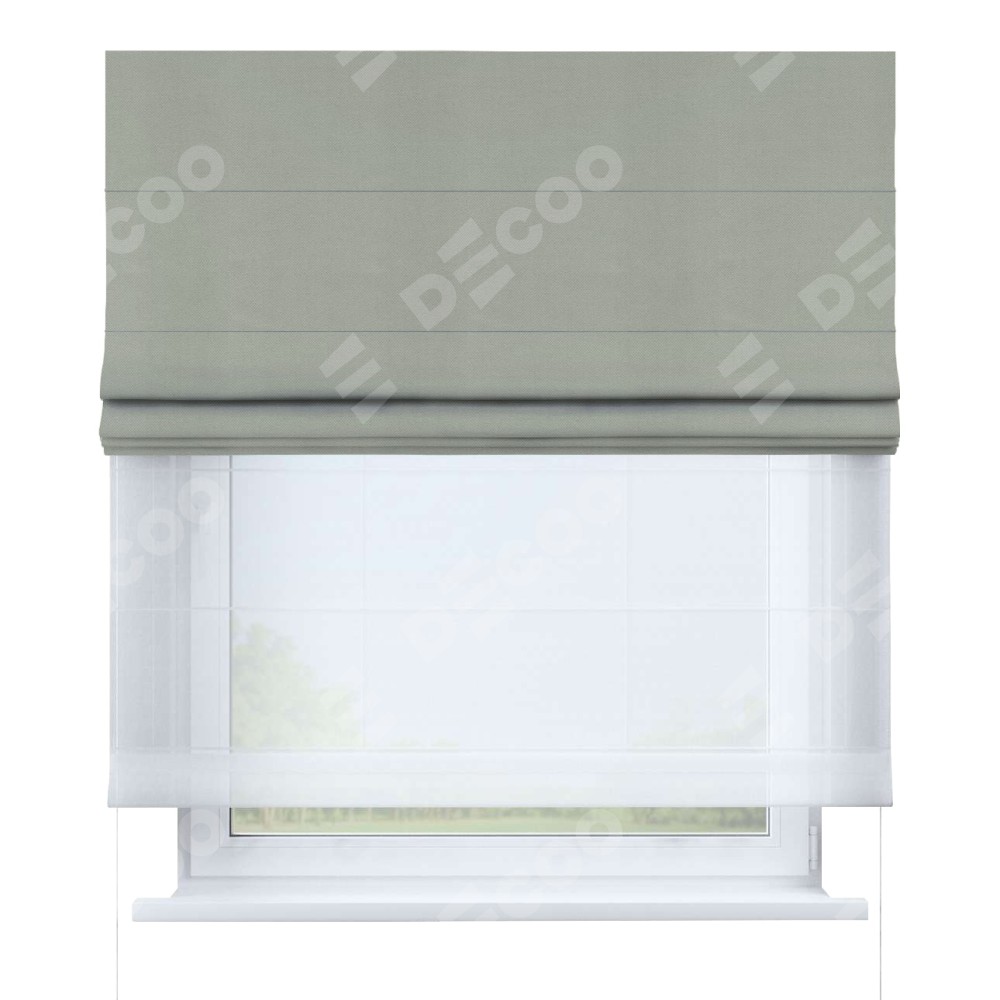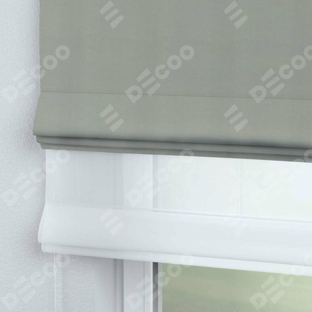 Римская штора день-ночь производителя «Cortin», используется для проёма, пошита из двух полотен, с лицевой стороны вельвет светло-серый артикул 30981, вторая ткань тюль (по стандарту комплектуется тюль белого цвета артикул V-01). Имеет универсальный механизм и подходит для монтажа: на потолок, на стену и в нишу.