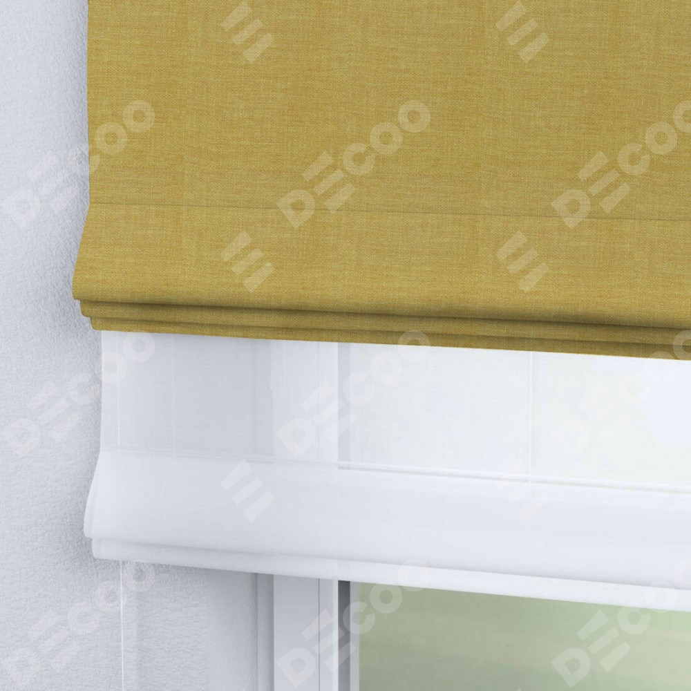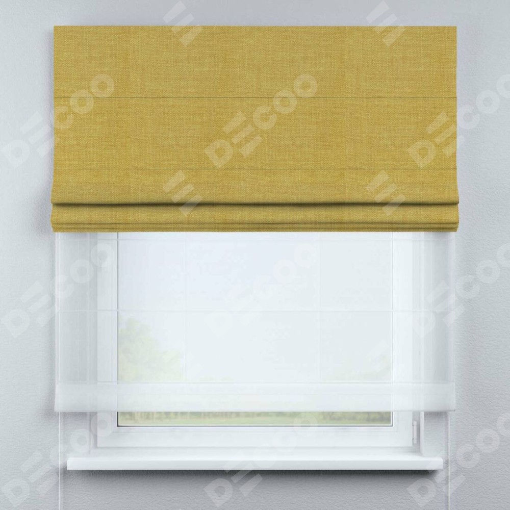 Римская штора день-ночь производителя «Cortin», используется для проёма, пошита из двух полотен, с лицевой стороны лён горчичный артикул 74740, вторая ткань тюль (по стандарту комплектуется тюль белого цвета артикул V-01). Имеет универсальный механизм и подходит для монтажа: на потолок, на стену и в нишу.