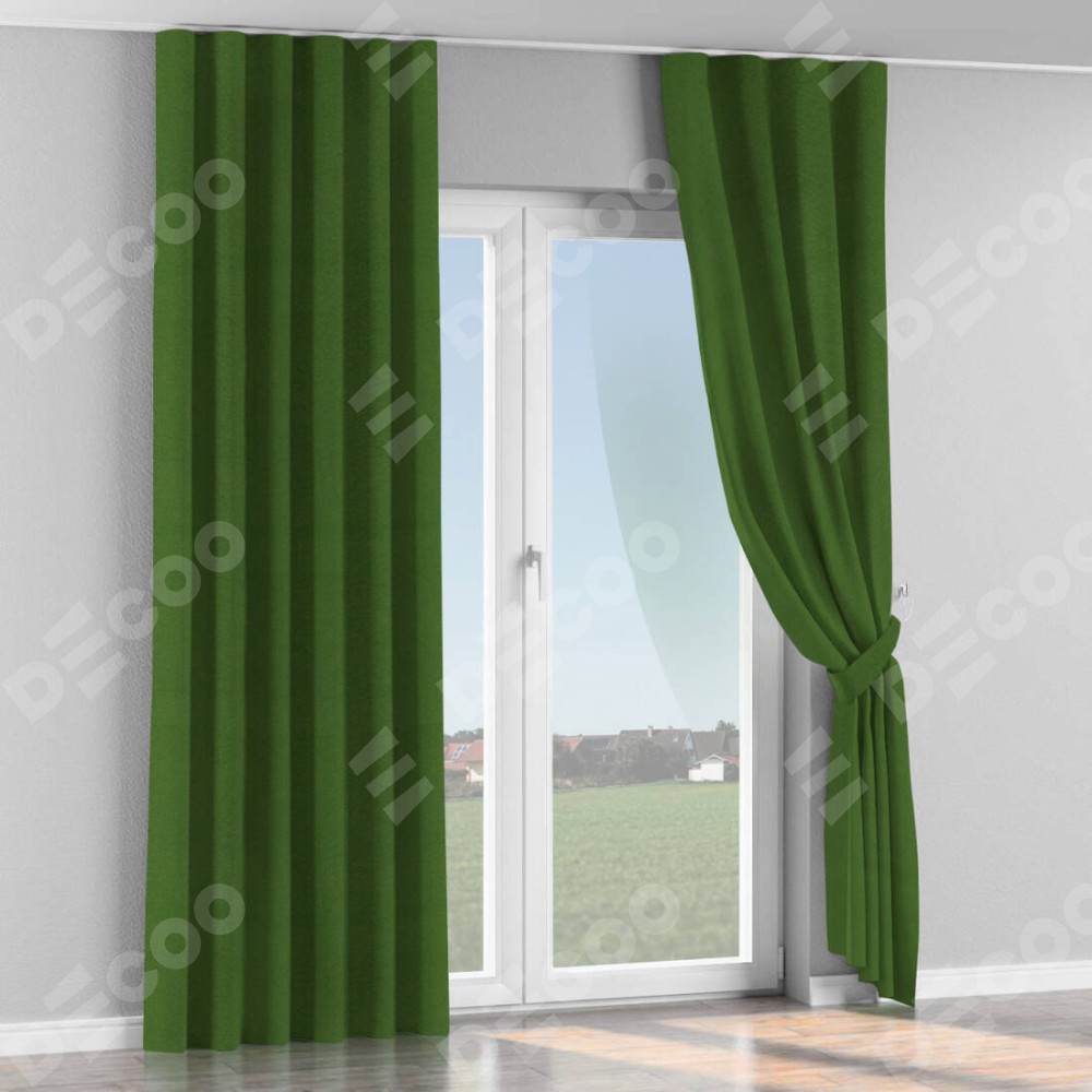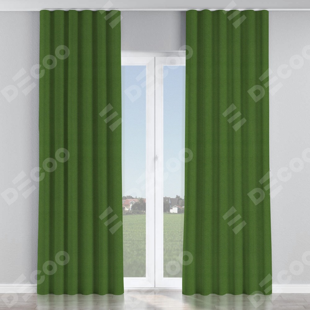 Комплект прямых штор, от производителя «Cortin», пошиты из ткани блэкаут однотонный зелёный перламутр, артикул ткани 81859п. С изнаночной стороны в верхней части штор пристрачивается шторная лента с декоративными складками «Волна». Для создания элегантных складок прямые шторы шьются по стандарту с коэффициентом 1:2 (на 100 см. ширины проёма 200 см. ширины ткани).