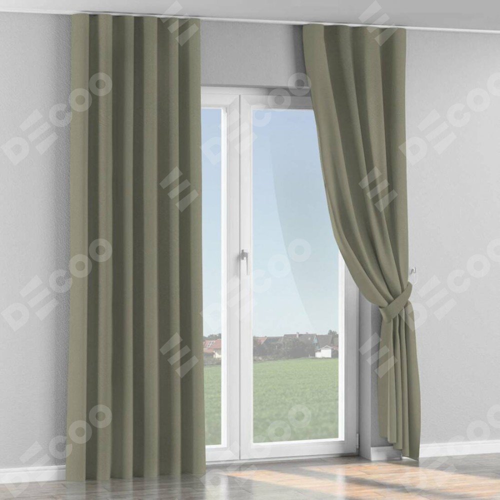 Комплект прямых штор, от производителя «Cortin», пошиты из ткани блэкаут однотонный серо-зелёный, артикул ткани 29568. С изнаночной стороны в верхней части штор пристрачивается шторная лента с декоративными складками «Волна». Для создания элегантных складок прямые шторы шьются по стандарту с коэффициентом 1:2 (на 100 см. ширины проёма 200 см. ширины ткани).