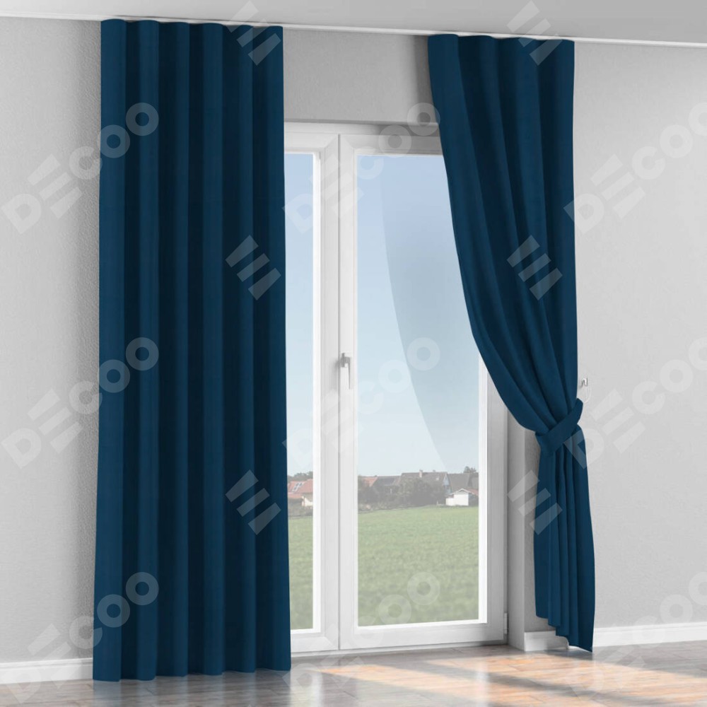 Комплект прямых штор, от производителя «Cortin», пошиты из ткани блэкаут однотонный синий, артикул ткани 29327. С изнаночной стороны в верхней части штор пристрачивается шторная лента с декоративными складками «Волна». Для создания элегантных складок прямые шторы шьются по стандарту с коэффициентом 1:2 (на 100 см. ширины проёма 200 см. ширины ткани).