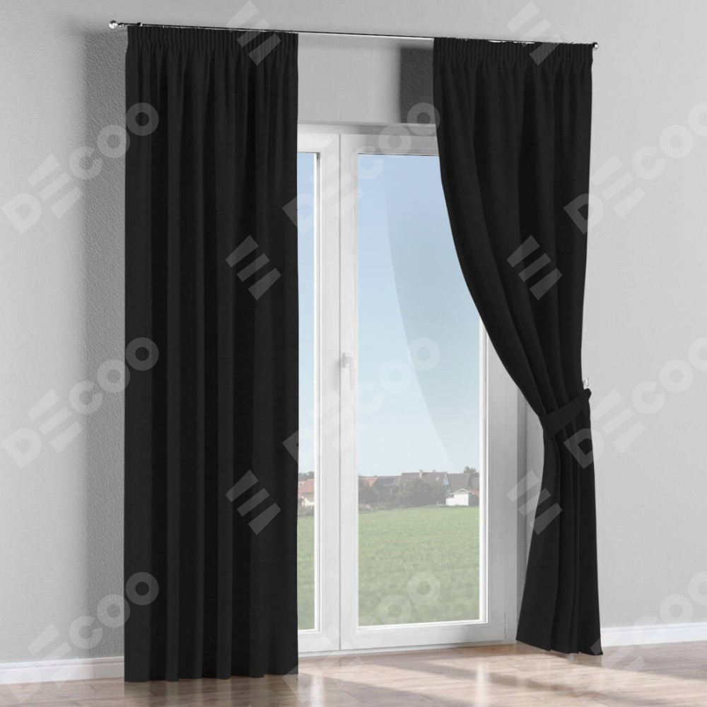 Комплект прямых штор, от производителя «Cortin», пошиты из ткани блэкаут однотонный черный, артикул ткани 79904. С изнаночной стороны в верхней части штор пристрачивается шторная лента с декоративными складками «Карандаш». Для создания элегантных складок прямые шторы шьются по стандарту с коэффициентом 1:2 (на 100 см. ширины проёма 200 см. ширины ткани).