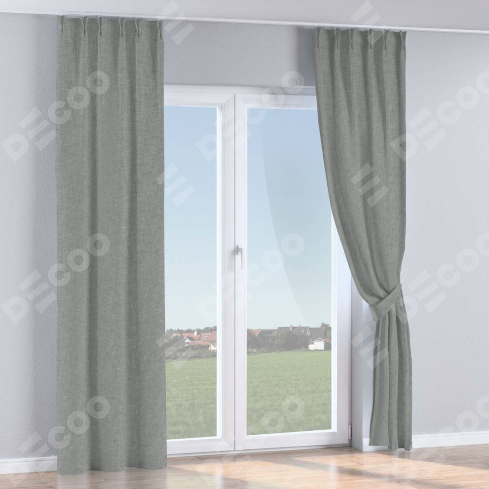 Комплект прямых штор, от производителя «Cortin», пошиты из ткани рогожка димаут тёмно-серый, артикул ткани 80418. С изнаночной стороны в верхней части штор пристрачивается шторная лента с декоративными складками «Кустик». Для создания элегантных складок прямые шторы шьются по стандарту с коэффициентом 1:2 (на 100 см. ширины проёма 200 см. ширины ткани).