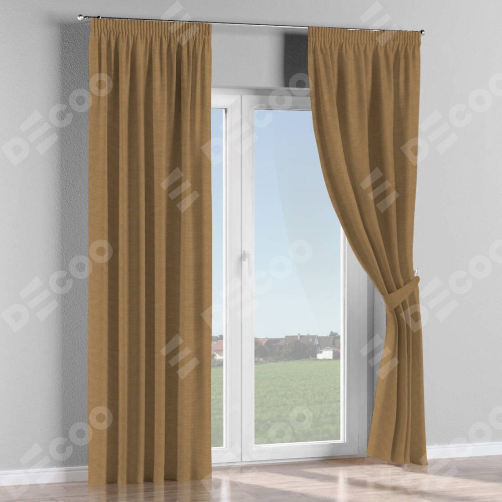 Комплект прямых штор, от производителя «Cortin», пошиты из ткани лён димаут коричневый, артикул ткани 83026. С изнаночной стороны в верхней части штор пристрачивается шторная лента с декоративными складками «Карандаш». Для создания элегантных складок прямые шторы шьются по стандарту с коэффициентом 1:2 (на 100 см. ширины проёма 200 см. ширины ткани).