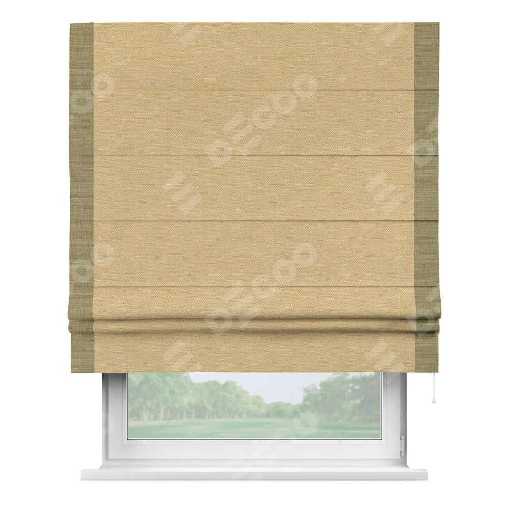 Римская штора производителя «Cortin», используется для проёма, пошита из ткани лён темно-бежевый, артикул 53433. Отделка шторы кантом «Стрим Дуо», ткань для канта используется из льна разной расцветки на выбор. Имеет универсальный механизм и подходит для монтажа: на потолок, на стену и в нишу.