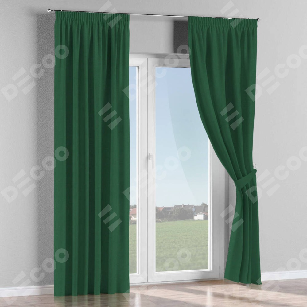 Комплект прямых штор, от производителя «Cortin», пошиты из ткани лён димаут тёмно-зелёный, артикул ткани 16246. С изнаночной стороны в верхней части штор пристрачивается шторная лента с декоративными складками «Карандаш». Для создания элегантных складок прямые шторы шьются по стандарту с коэффициентом 1:2 (на 100 см. ширины проёма 200 см. ширины ткани).