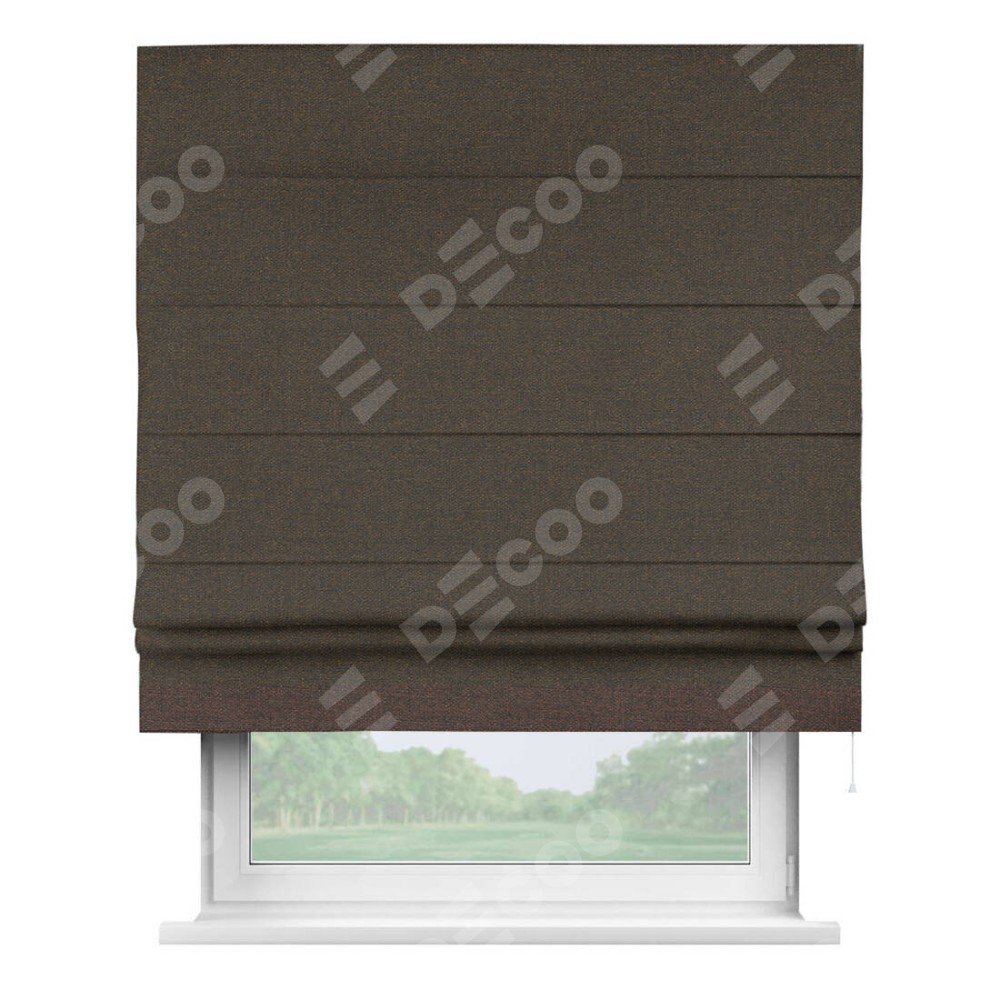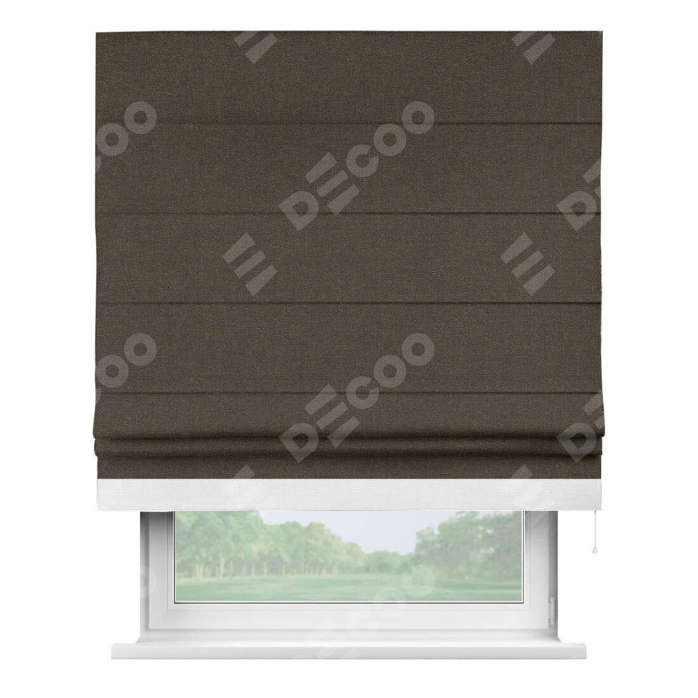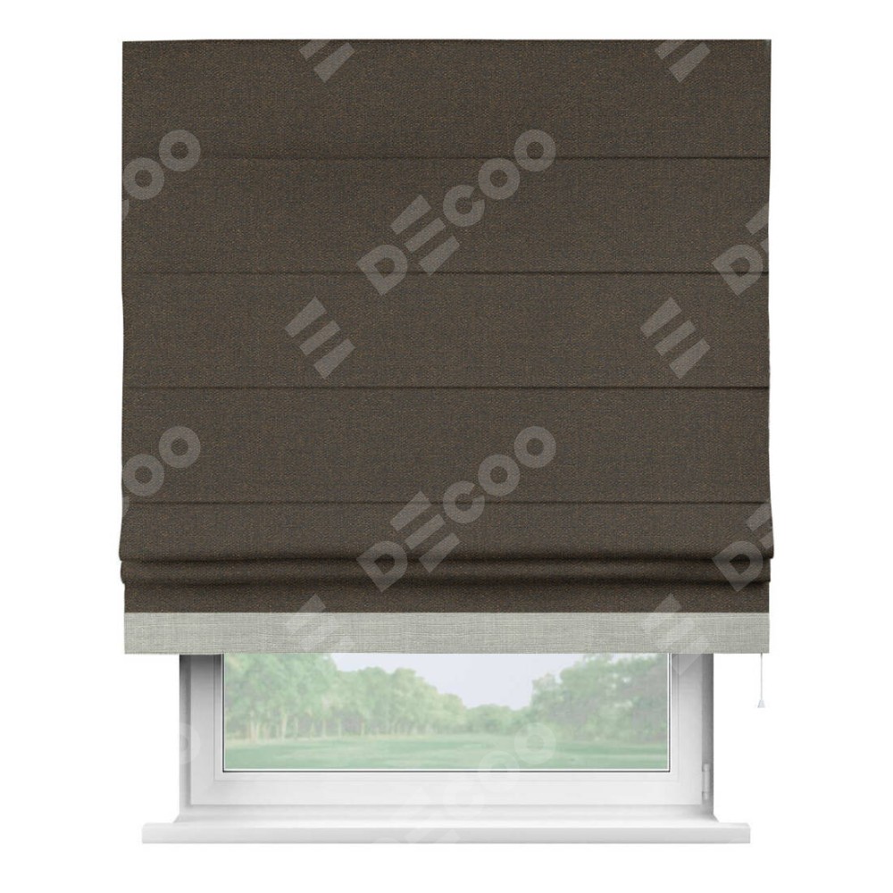 Римская штора производителя «Cortin», используется для проёма, пошита из ткани лён темно-коричневый, артикул 53444. Отделка шторы кантом «Джестер», ткань для канта используется из льна разной расцветки на выбор. Имеет универсальный механизм и подходит для монтажа: на потолок, на стену и в нишу.