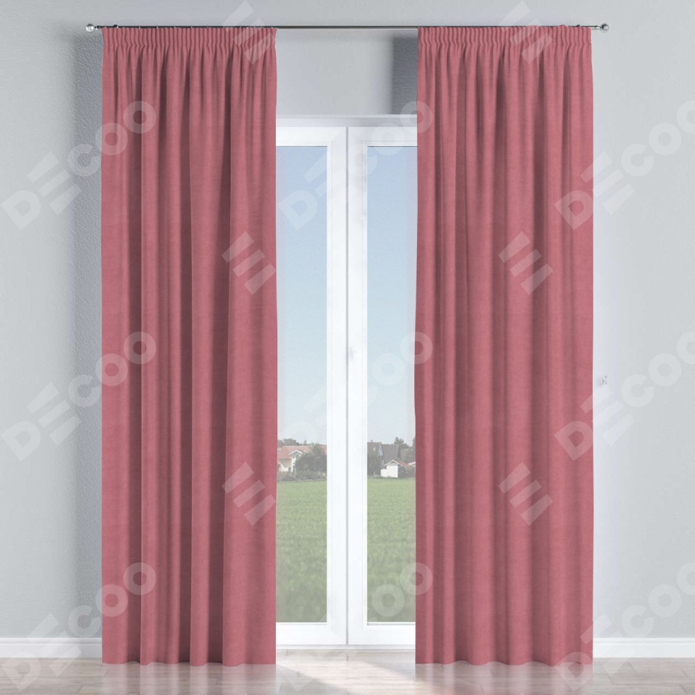 Комплект прямых штор, от производителя «Cortin», пошиты из ткани вельвет брусника, артикул ткани 85550. С изнаночной стороны в верхней части штор пристрачивается шторная лента с декоративными складками «Карандаш». Для создания элегантных складок прямые шторы шьются по стандарту с коэффициентом 1:2 (на 100 см. ширины проёма 200 см. ширины ткани).
