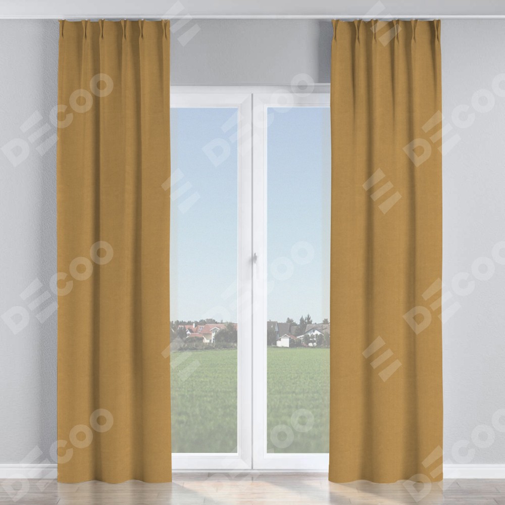 Комплект прямых штор, от производителя «Cortin», пошиты из ткани вельвет горчица, артикул ткани 17760. С изнаночной стороны в верхней части штор пристрачивается шторная лента с декоративными складками «Кустик». Для создания элегантных складок прямые шторы шьются по стандарту с коэффициентом 1:2 (на 100 см. ширины проёма 200 см. ширины ткани).