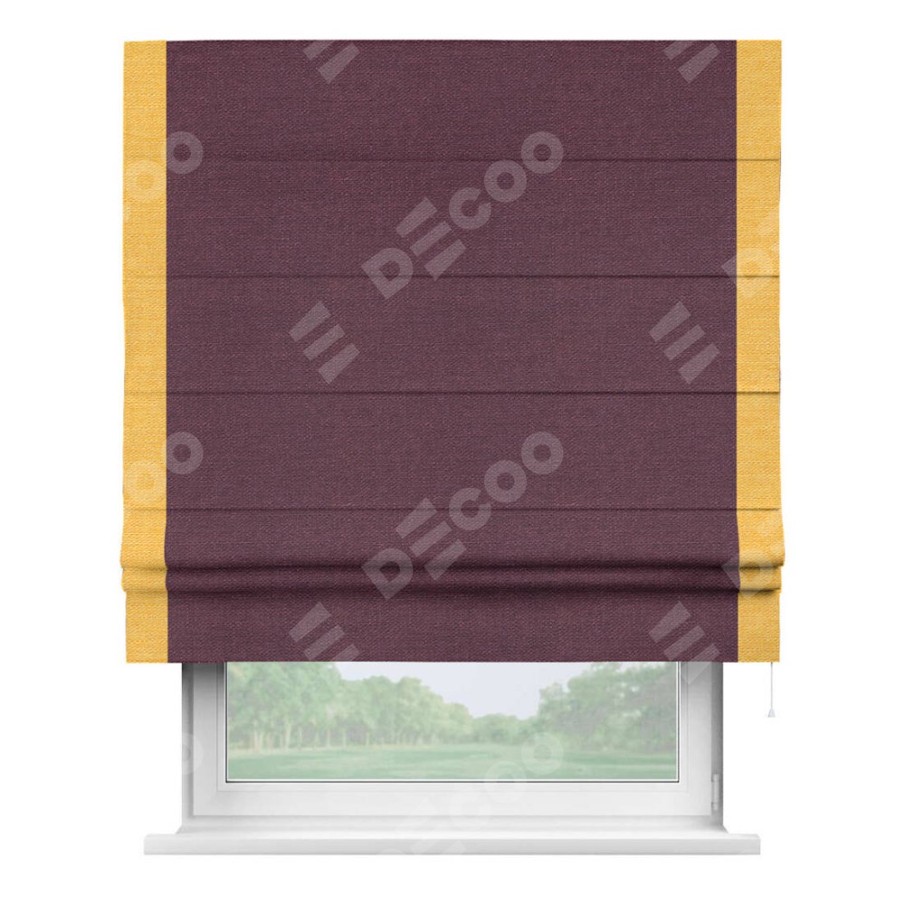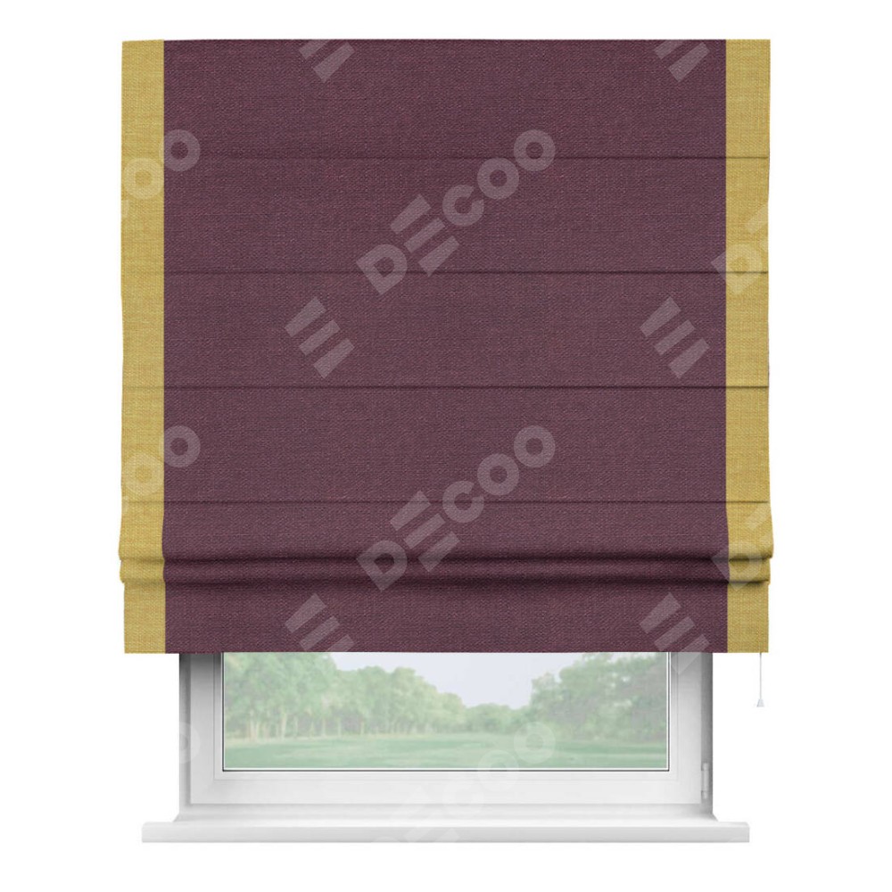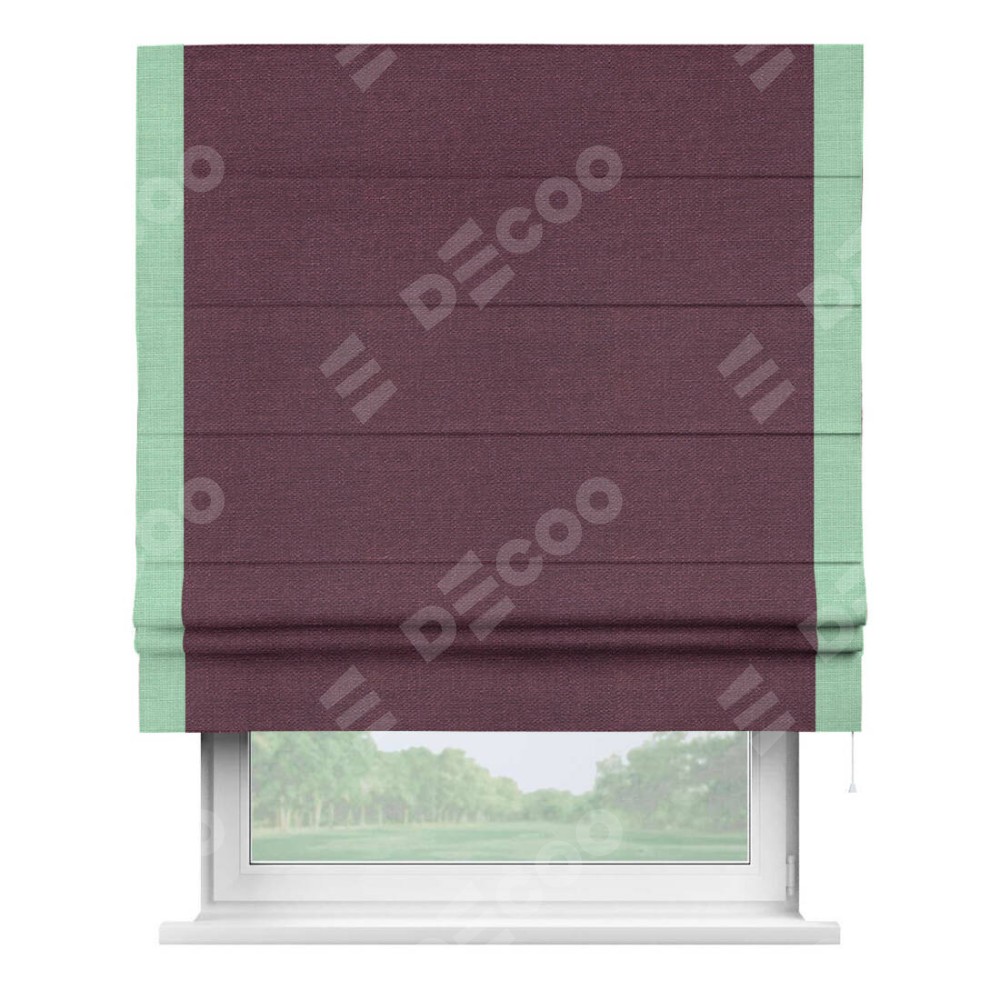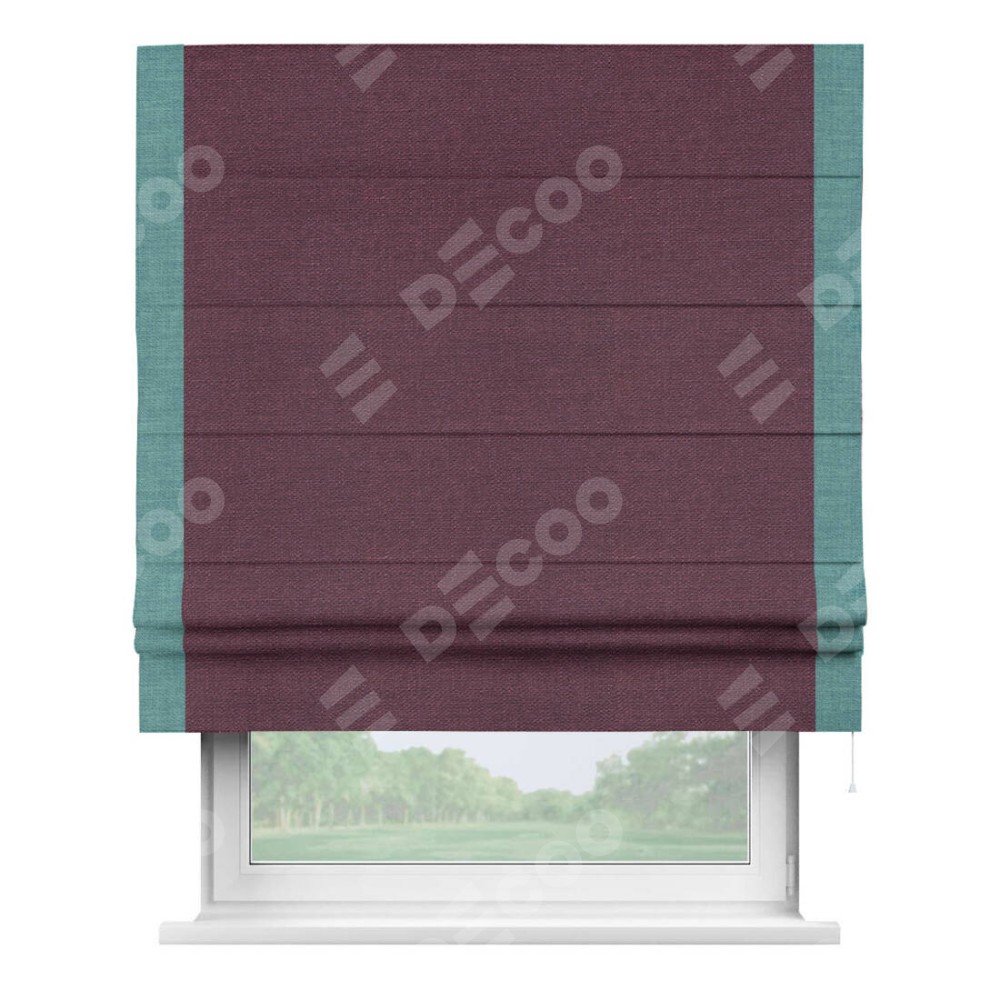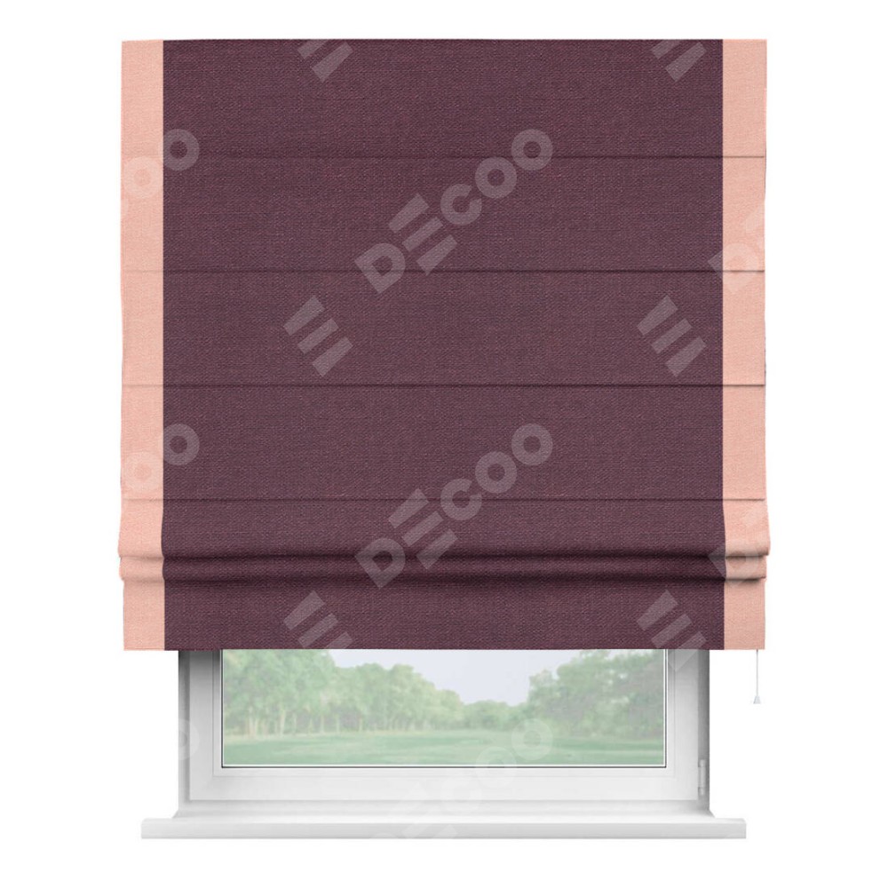 Римская штора производителя «Cortin», используется для проёма, пошита из ткани лён фиолетовый, артикул 85907. Отделка шторы кантом «Стрим Дуо», ткань для канта используется из льна разной расцветки на выбор. Имеет универсальный механизм и подходит для монтажа: на потолок, на стену и в нишу.