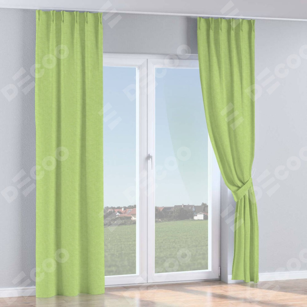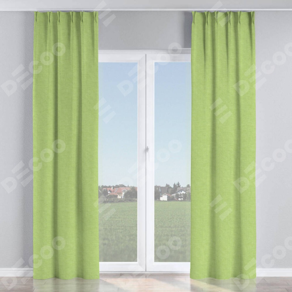Комплект прямых штор, от производителя «Cortin», пошиты из ткани лён зелёный, артикул ткани 85906. С изнаночной стороны в верхней части штор пристрачивается шторная лента с декоративными складками «Кустик». Для создания элегантных складок прямые шторы шьются по стандарту с коэффициентом 1:2 (на 100 см. ширины проёма 200 см. ширины ткани).