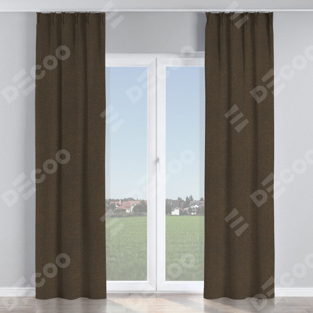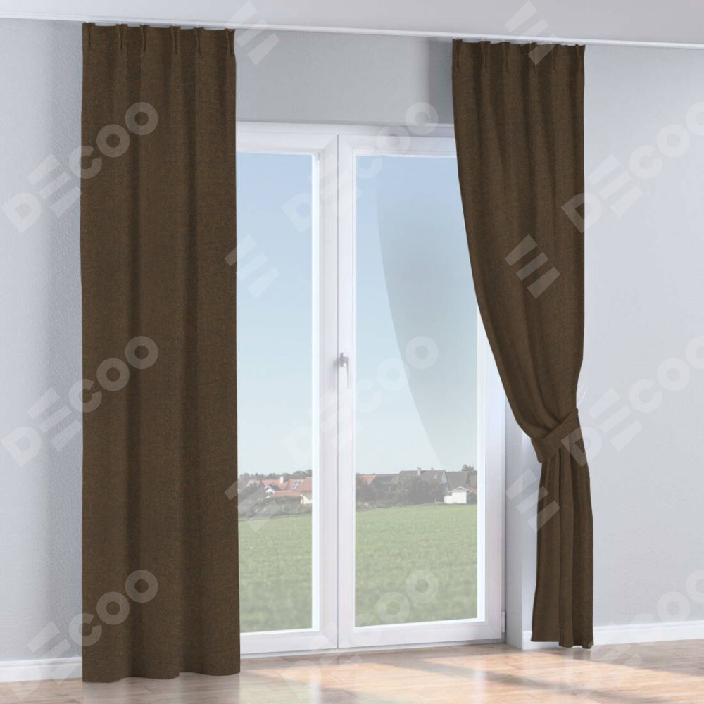 Комплект прямых штор, от производителя «Cortin», пошиты из ткани лён тёмно-коричневый, артикул ткани 53444. С изнаночной стороны в верхней части штор пристрачивается шторная лента с декоративными складками «Кустик». Для создания элегантных складок прямые шторы шьются по стандарту с коэффициентом 1:2 (на 100 см. ширины проёма 200 см. ширины ткани).