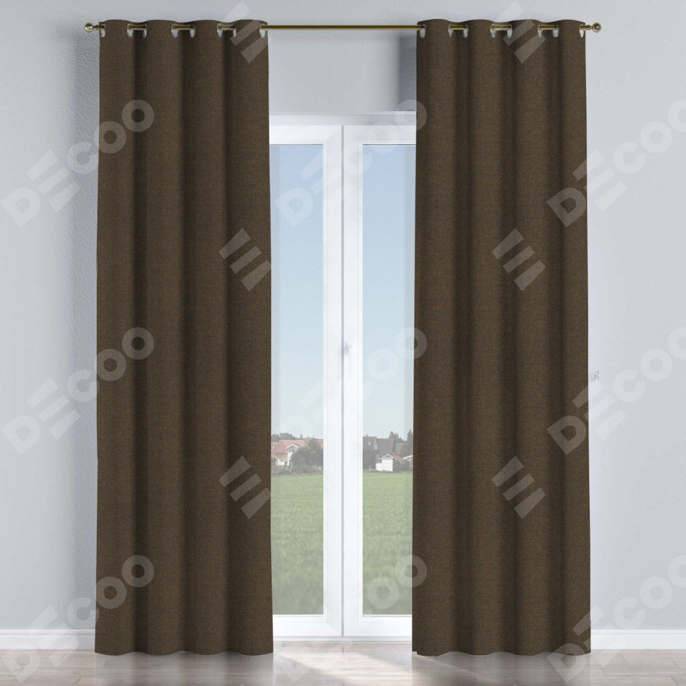 Комплект прямых штор, от производителя «Cortin», пошиты из ткани лён тёмно-коричневый, артикул ткани 53444. Данная модель пошита на люверсах, комплектуется на выбор круглым карнизом и подходит для монтажа на стену или потолок. Прямые шторы на люверсах шьются по стандарту с коэффициентом 1/2 (на 100 см. ширины проёма 200 см. ширины ткани), отличительным преимуществом данной модели является простой способ монтажа. Достаточно повесить ее на трубу и штора готова!