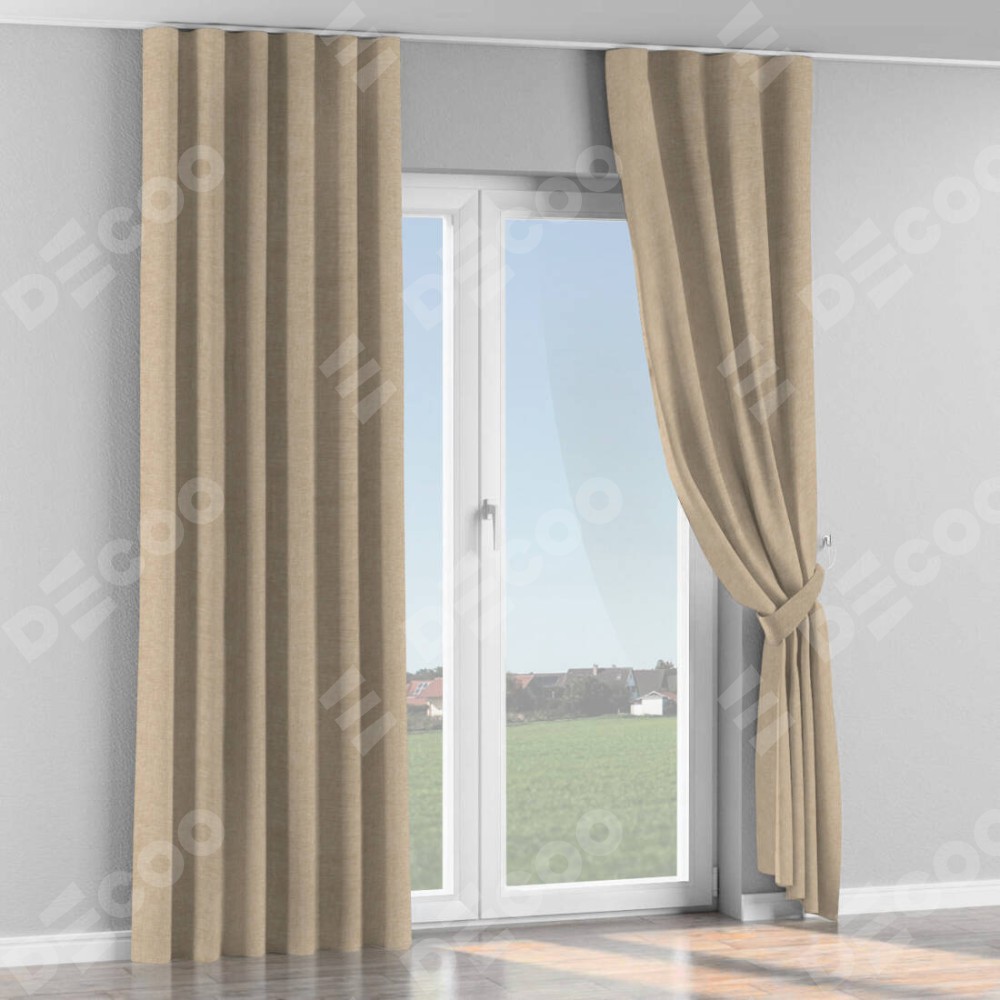Комплект прямых штор, от производителя «Cortin», пошиты из ткани лён кашемир бежевый, артикул ткани 17206. С изнаночной стороны в верхней части штор пристрачивается шторная лента с декоративными складками «Волна». Для создания элегантных складок прямые шторы шьются по стандарту с коэффициентом 1:2 (на 100 см. ширины проёма 200 см. ширины ткани).