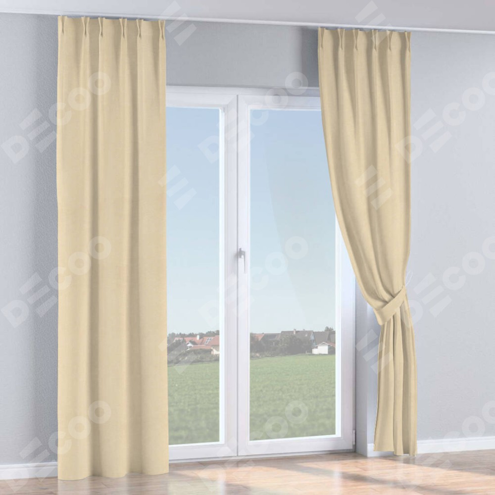Комплект прямых штор, от производителя «Cortin», пошиты из ткани софт однотонный бежевый лайт, артикул ткани 33100. С изнаночной стороны в верхней части штор пристрачивается шторная лента с декоративными складками «Кустик». Для создания элегантных складок прямые шторы шьются по стандарту с коэффициентом 1:2 (на 100 см. ширины проёма 200 см. ширины ткани).