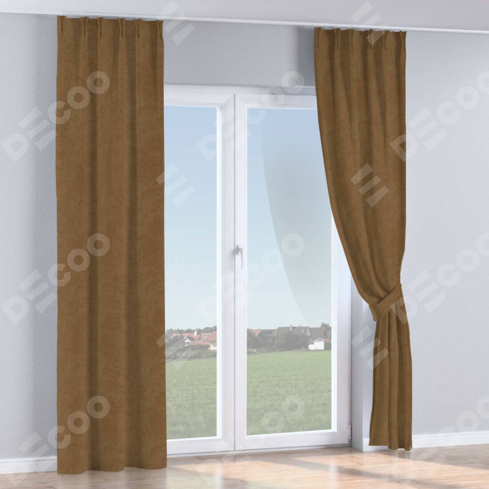Комплект прямых штор, от производителя «Cortin», пошиты из ткани софт однотонный бронзовый, артикул ткани 33099. С изнаночной стороны в верхней части штор пристрачивается шторная лента с декоративными складками «Кустик». Для создания элегантных складок прямые шторы шьются по стандарту с коэффициентом 1:2 (на 100 см. ширины проёма 200 см. ширины ткани).