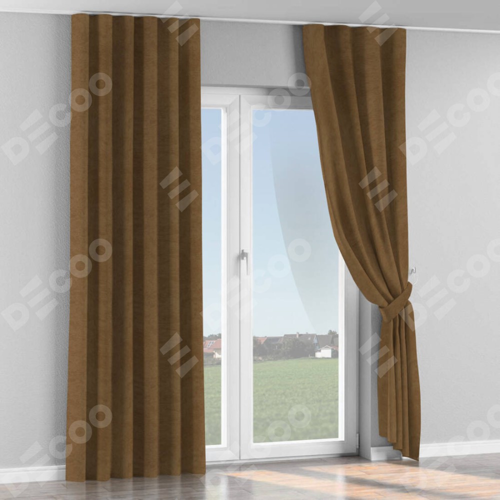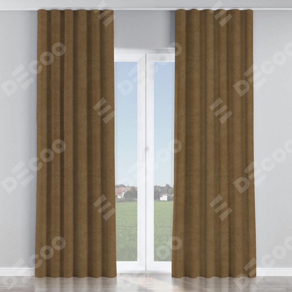 Комплект прямых штор, от производителя «Cortin», пошиты из ткани софт однотонный бронзовый, артикул ткани 33099. С изнаночной стороны в верхней части штор пристрачивается шторная лента с декоративными складками «Волна». Для создания элегантных складок прямые шторы шьются по стандарту с коэффициентом 1:2 (на 100 см. ширины проёма 200 см. ширины ткани).