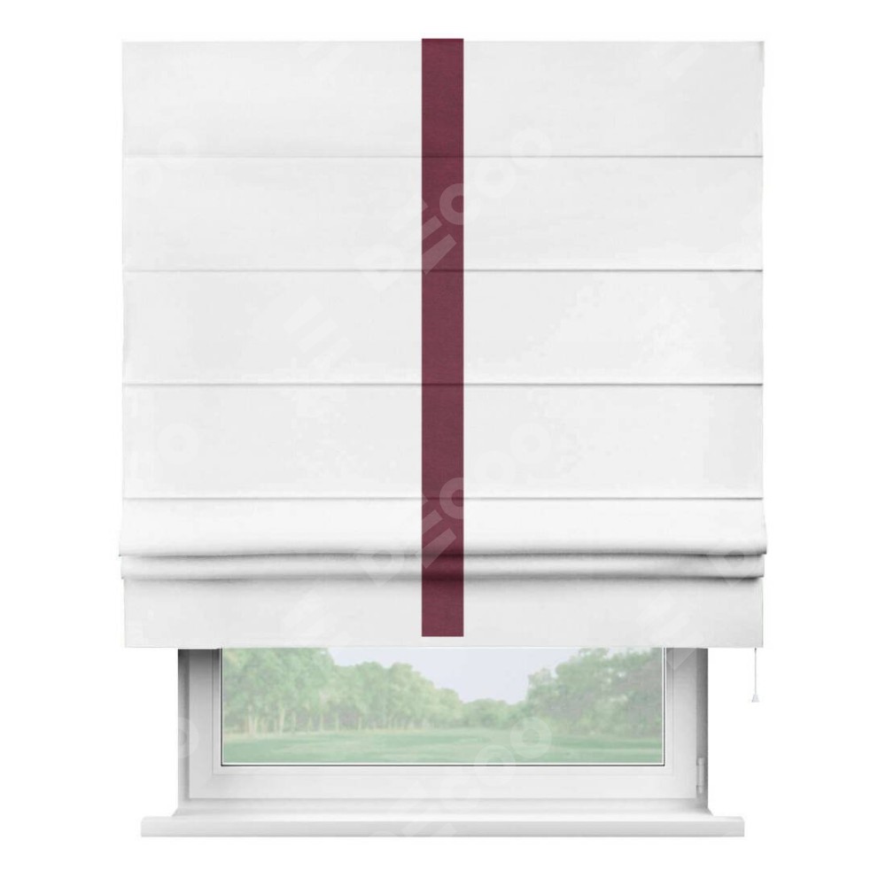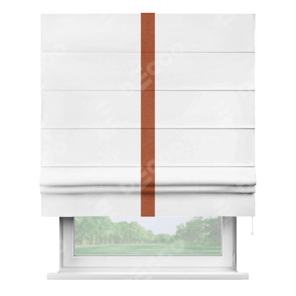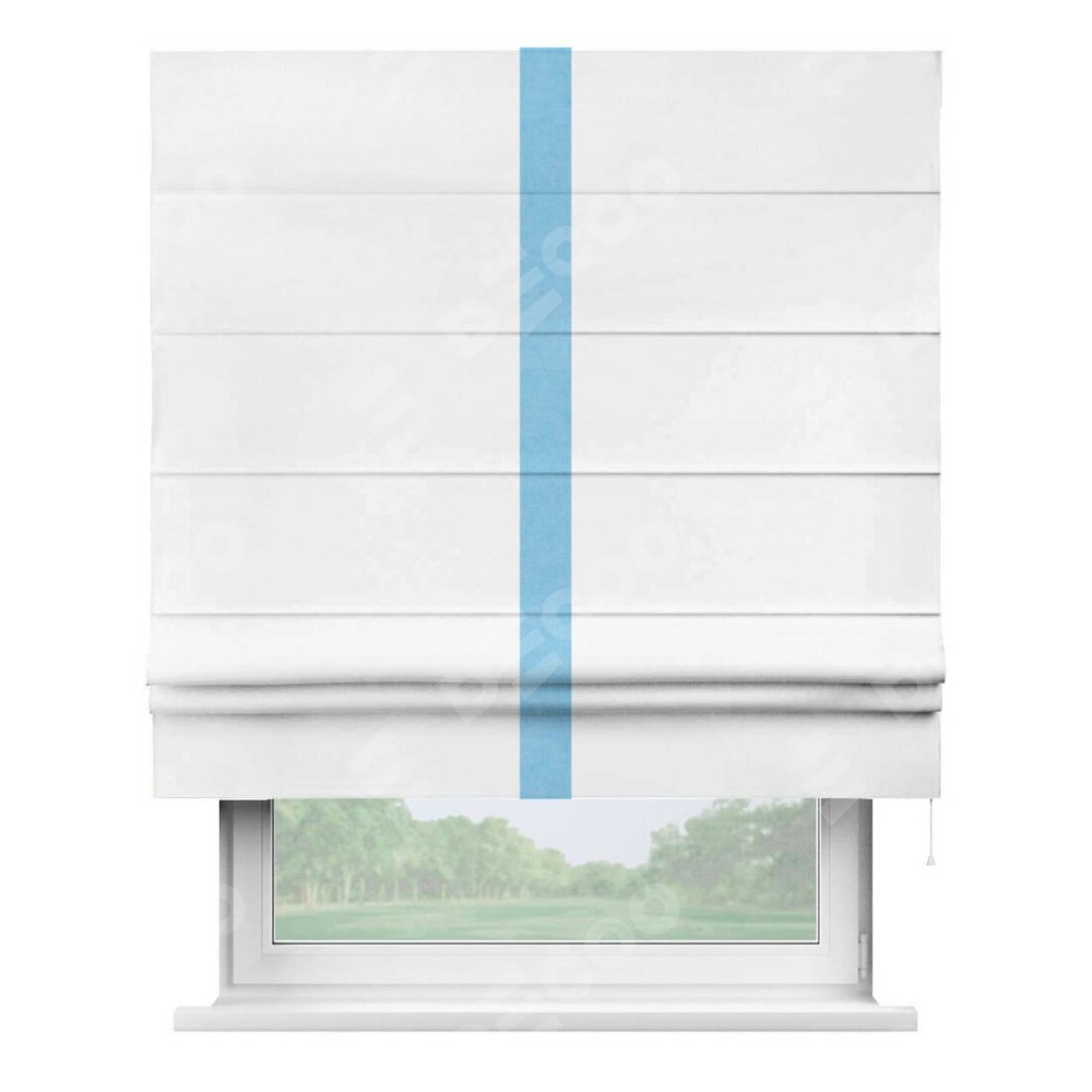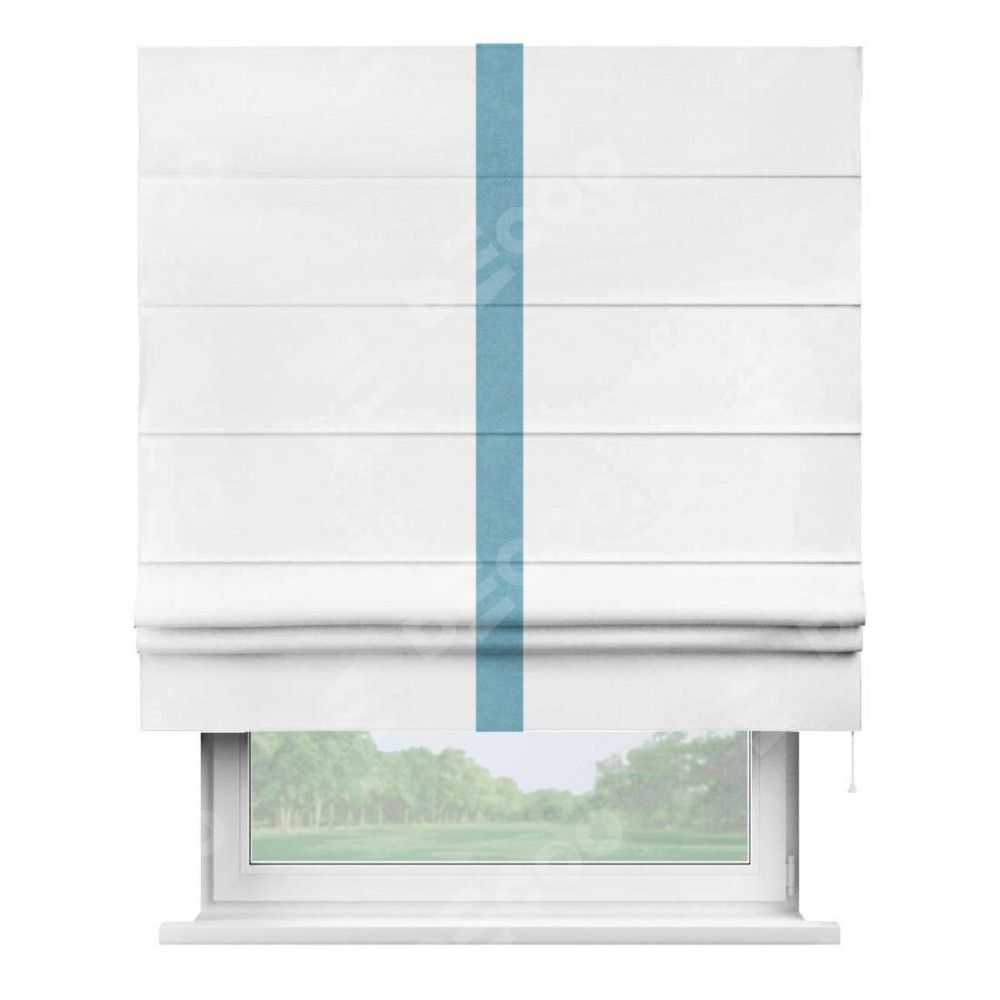 Римская штора производителя «Cortin», используется для проёма, пошита из ткани вельвет белый, артикул ткани 10810. Отделка шторы кантом «Хайвей», ткань для канта используется из вельвета разной расцветки на выбор. Имеет универсальный механизм и подходит для монтажа: на потолок, на стену и в нишу.