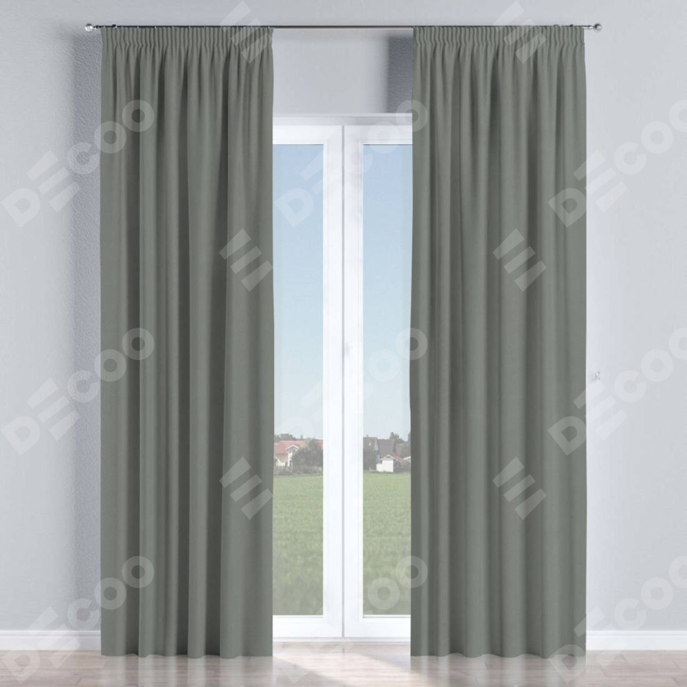 Комплект прямых штор, от производителя «Cortin», пошиты из ткани блэкаут однотонный тёмно-серый, артикул ткани 18077. С изнаночной стороны в верхней части штор пристрачивается шторная лента с декоративными складками «Карандаш». Для создания элегантных складок прямые шторы шьются по стандарту с коэффициентом 1:2 (на 100 см. ширины проёма 200 см. ширины ткани).