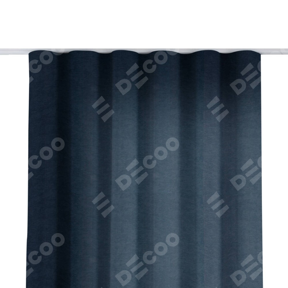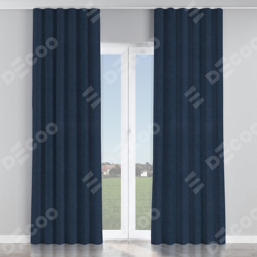 Комплект прямых штор, от производителя «Cortin», пошиты из ткани софт однотонный тёмно-синий, артикул ткани 33111. С изнаночной стороны в верхней части штор пристрачивается шторная лента с декоративными складками «Волна». Для создания элегантных складок прямые шторы шьются по стандарту с коэффициентом 1:2 (на 100 см. ширины проёма 200 см. ширины ткани).