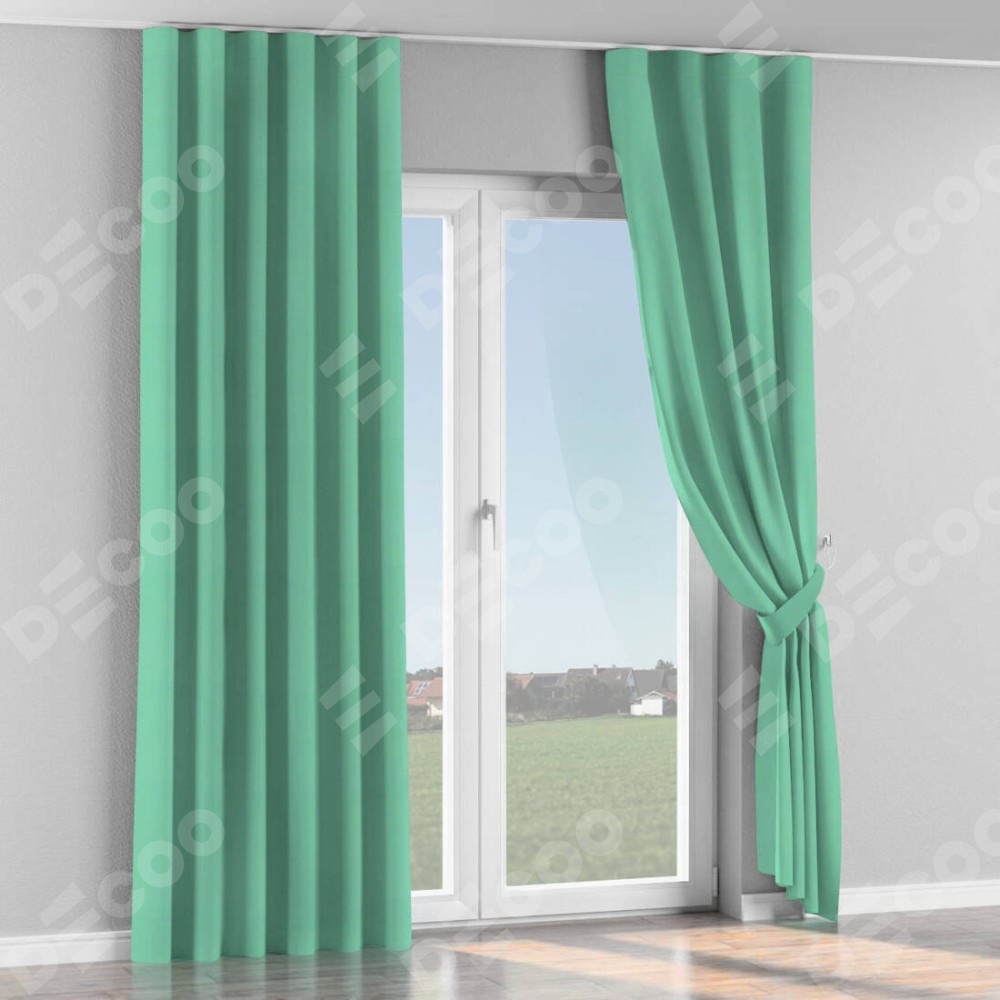 Комплект прямых штор, от производителя «Cortin», пошиты из ткани pipa блэкаут бирюза, артикул ткани 81852. С изнаночной стороны в верхней части штор пристрачивается шторная лента с декоративными складками «Волна». Для создания элегантных складок прямые шторы шьются по стандарту с коэффициентом 1:2 (на 100 см. ширины проёма 200 см. ширины ткани).