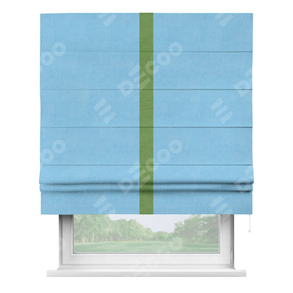 Римская штора производителя «Cortin», используется для проёма, пошита из ткани вельвет голубой, артикул ткани 85544. Отделка шторы кантом «Хайвей», ткань для канта используется из вельвета разной расцветки на выбор. Имеет универсальный механизм и подходит для монтажа: на потолок, на стену и в нишу.