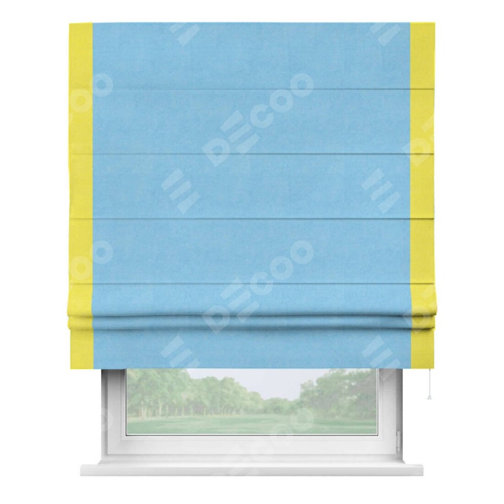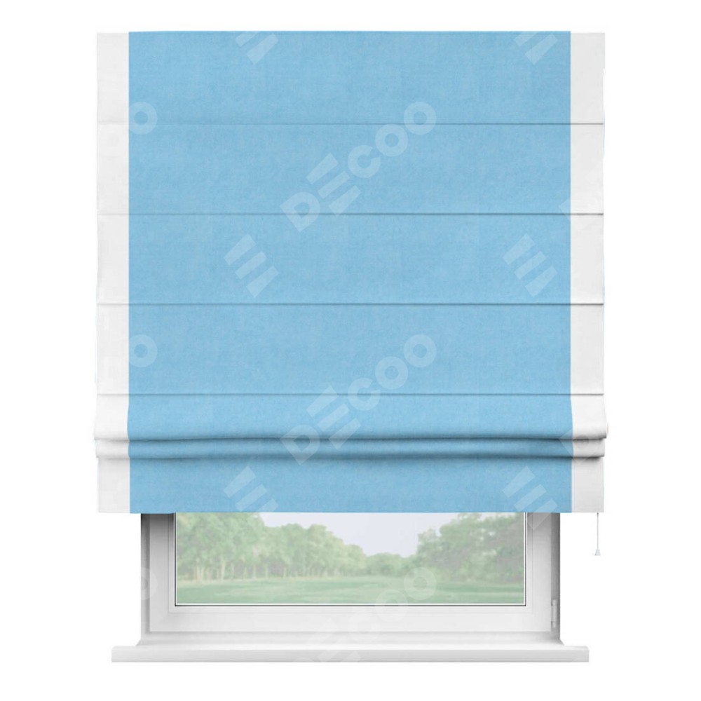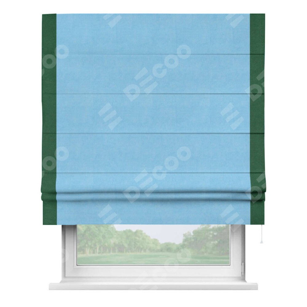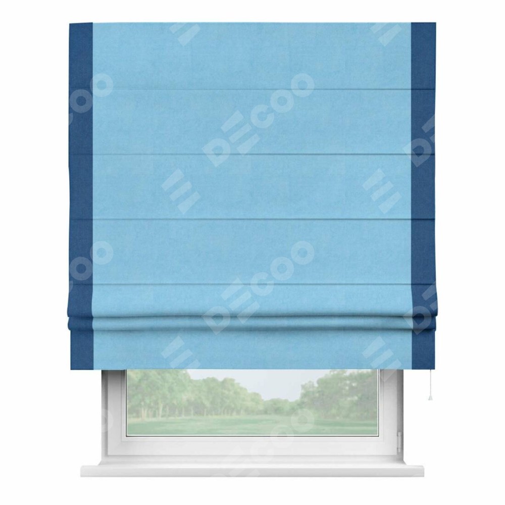 Римская штора производителя «Cortin», используется для проёма, пошита из ткани вельвет голубой, артикул ткани 85544. Отделка шторы кантом «Стрим Дуо», ткань для канта используется из вельвета разной расцветки на выбор. Имеет универсальный механизм и подходит для монтажа: на потолок, на стену и в нишу.