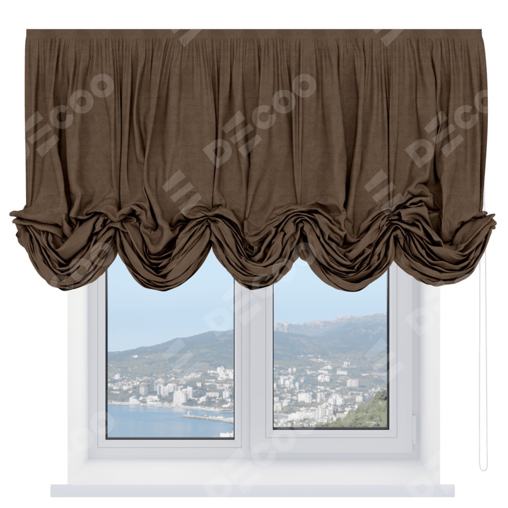 Австрийская штора производителя «Cortin», используется для проёма, пошита из ткани софт однотонный бронзовый, артикул ткани 33099. Имеет универсальный механизм и подходит для монтажа: на потолок и на стену.