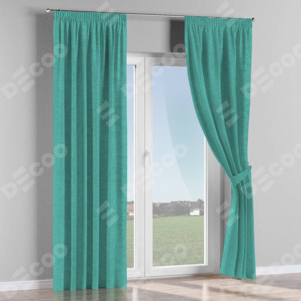 Комплект прямых штор, от производителя «Cortin», пошиты из ткани лён изумрудный, артикул ткани 85908. С изнаночной стороны в верхней части штор пристрачивается шторная лента с декоративными складками «Карандаш». Для создания элегантных складок прямые шторы шьются по стандарту с коэффициентом 1:2 (на 100 см. ширины проёма 200 см. ширины ткани).