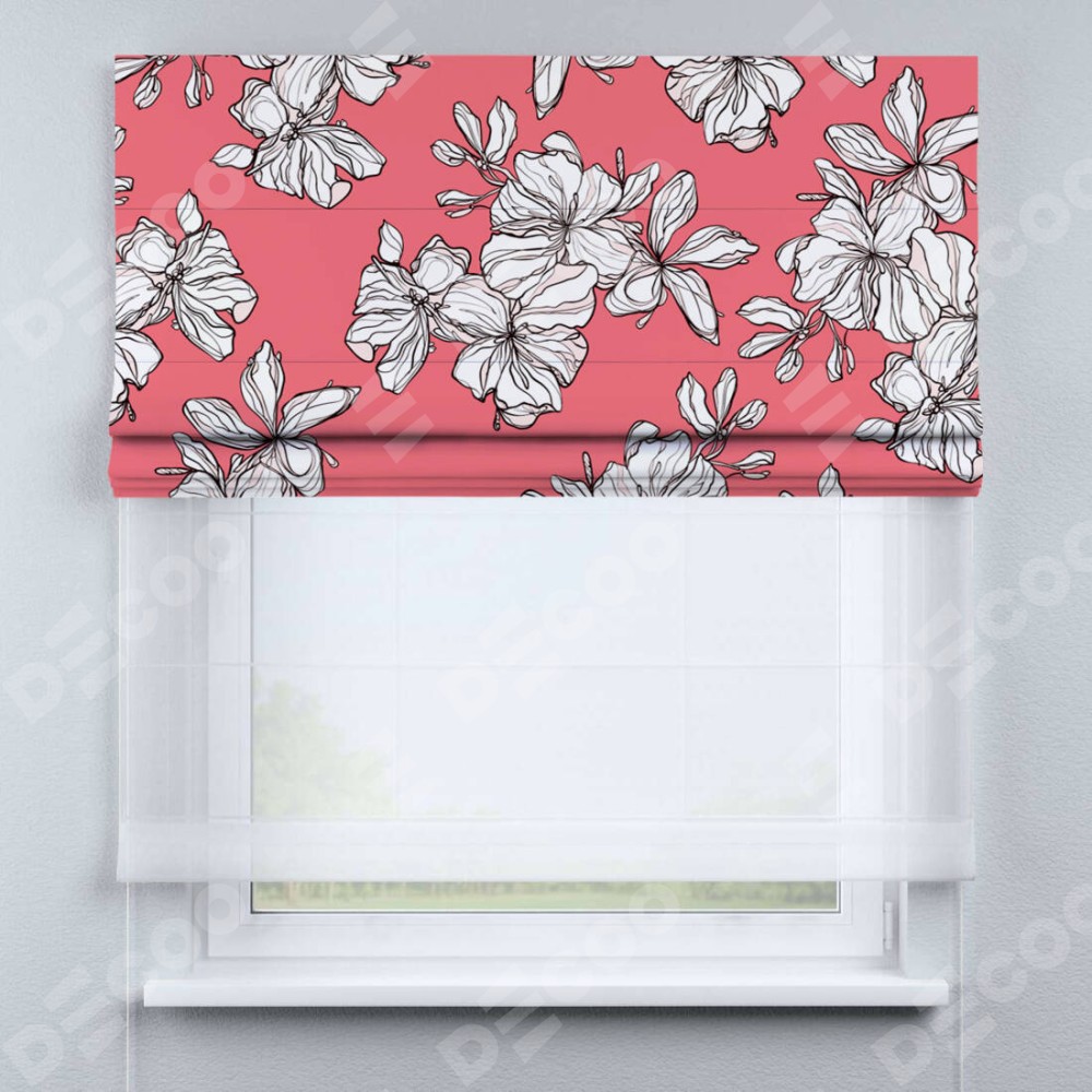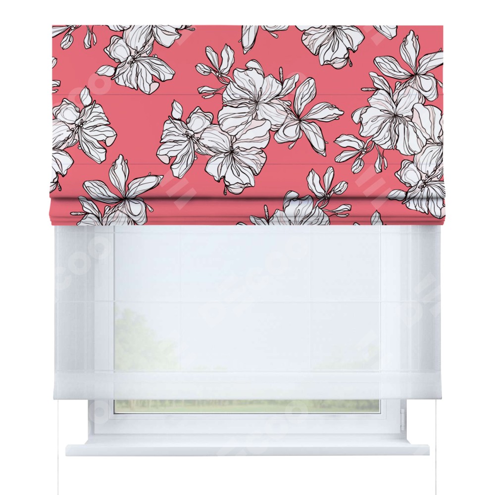 Римская штора день-ночь производителя «Cortin», используется для проёма, пошита из двух полотен, с лицевой блэкаут с нанесением сублимационной печати «Белые цветы», вторая ткань тюль (по стандарту комплектуется тюль белого цвета артикул V-01). Имеет универсальный механизм и подходит для монтажа: на потолок, на стену и в нишу.