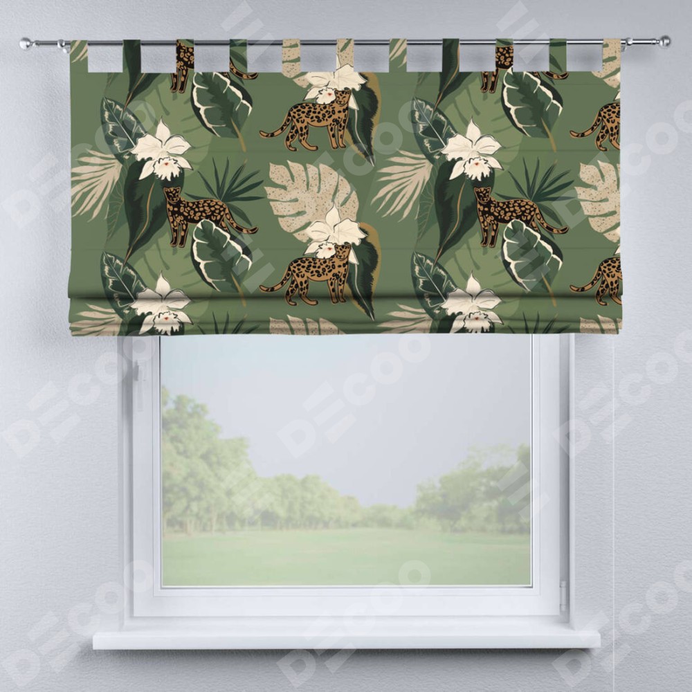 Римская штора производителя «Cortin», используется для проёма, пошита из ткани блэкаут с нанесением сублимационной печати «В тропическом лесу». Данная модель пошита на петлях, комплектуется на выбор круглым карнизом и подходит для монтажа на стену. Римская штора на петлях имеет простую систему регулировки высоты, отличительным преимуществом данной модели является простой способ монтажа. Достаточно повесить ее на трубу и штора готова!
