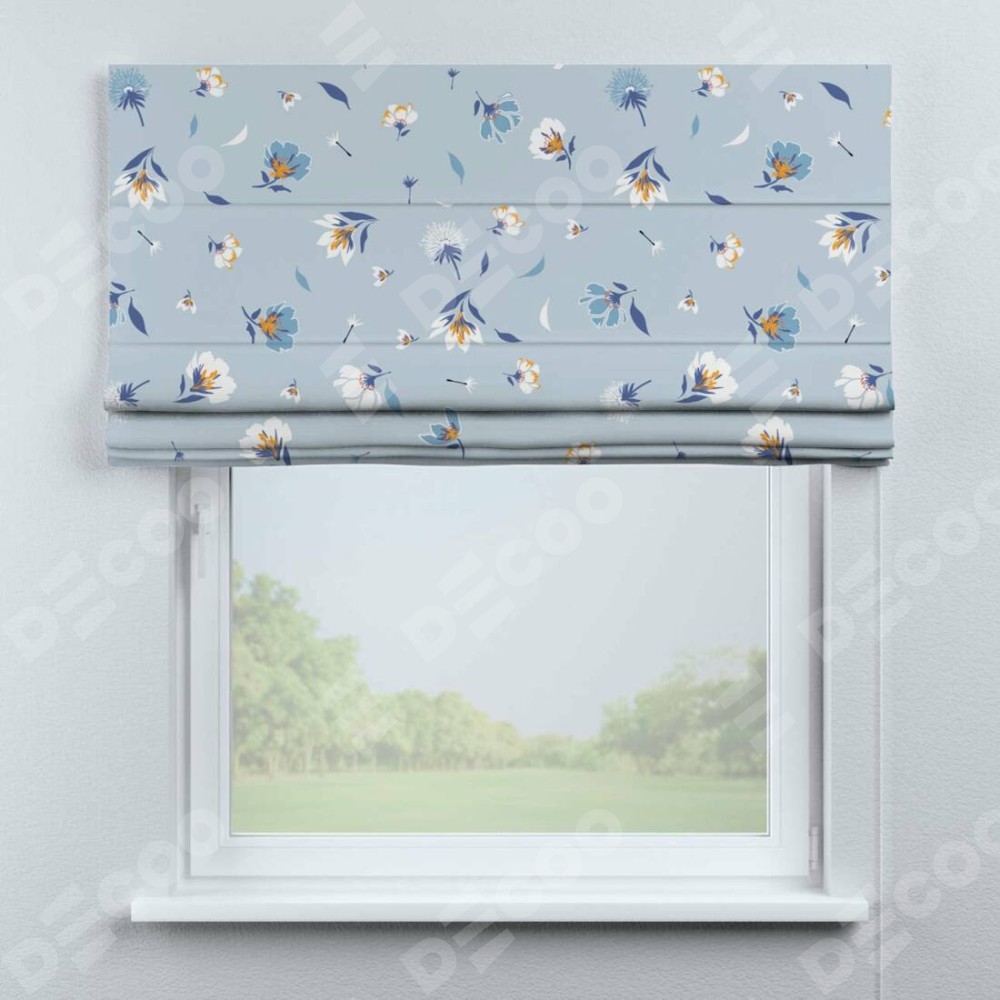 Римская штора производителя «Cortin», используется для проёма, пошита из ткани блэкаут с нанесением сублимационной печати «Голубые цветы». Имеет универсальный механизм и подходит для монтажа: на потолок, на стену и в нишу.
