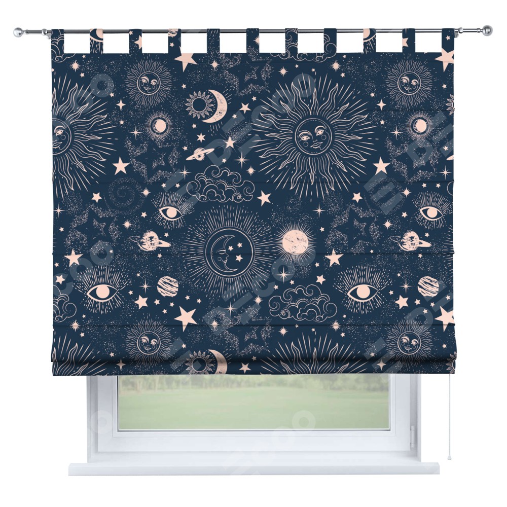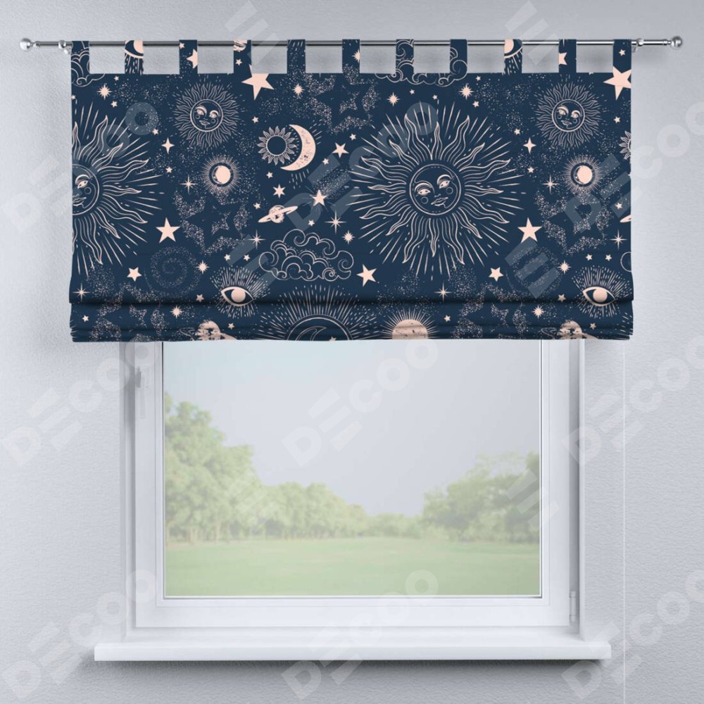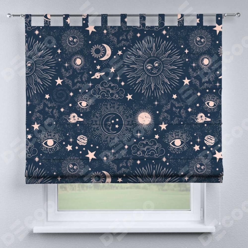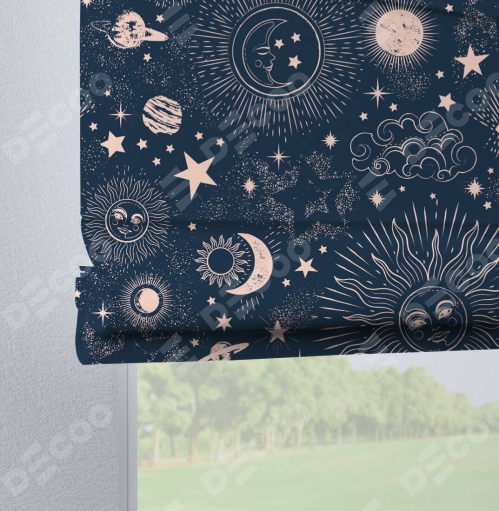 Римская штора производителя «Cortin», используется для проёма, пошита из ткани блэкаут с нанесением сублимационной печати «Звёзды и планеты». Данная модель пошита на петлях, комплектуется на выбор круглым карнизом и подходит для монтажа на стену. Римская штора на петлях имеет простую систему регулировки высоты, отличительным преимуществом данной модели является простой способ монтажа. Достаточно повесить ее на трубу и штора готова!