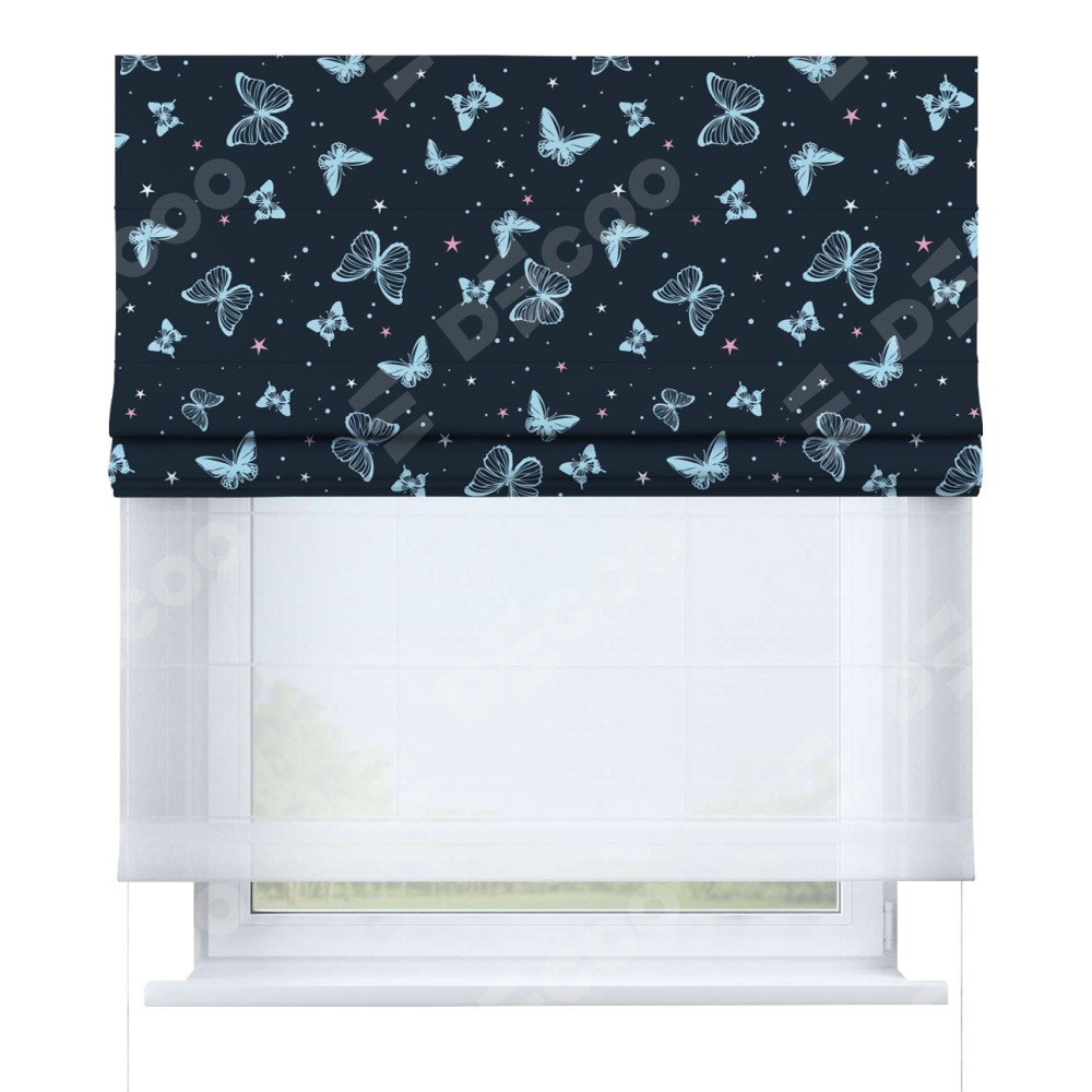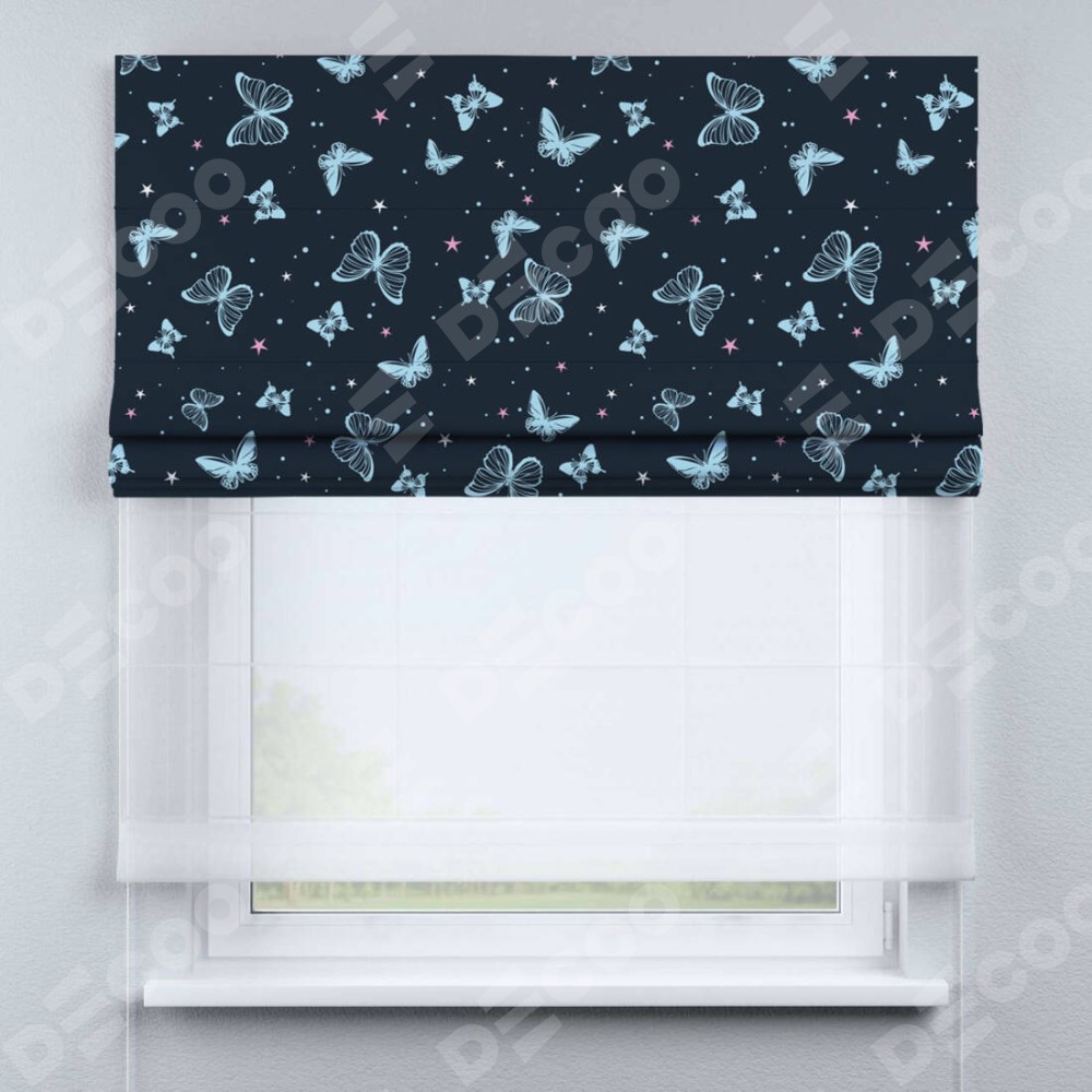 Римская штора день-ночь производителя «Cortin», используется для проёма, пошита из двух полотен, с лицевой блэкаут с нанесением сублимационной печати «Неоновые бабочки», вторая ткань тюль (по стандарту комплектуется тюль белого цвета артикул V-01). Имеет универсальный механизм и подходит для монтажа: на потолок, на стену и в нишу.