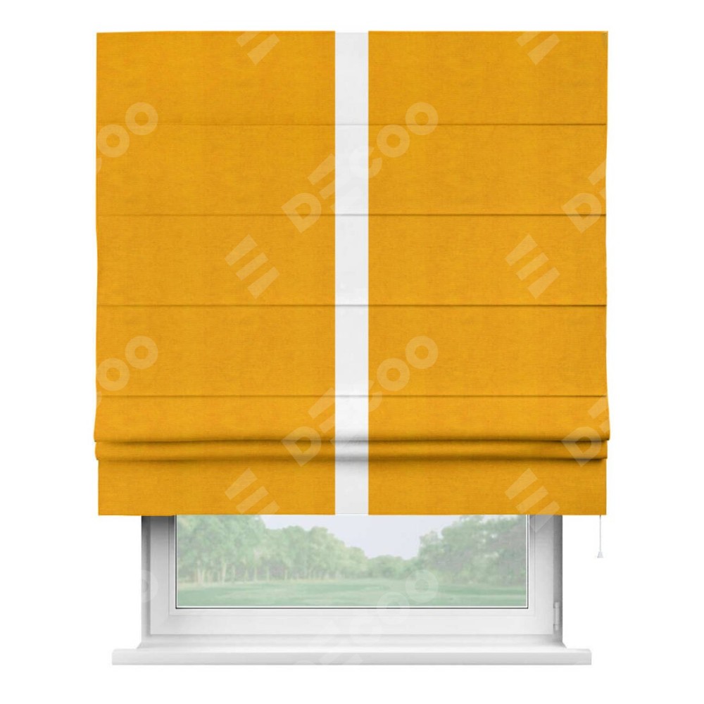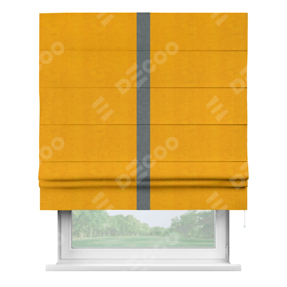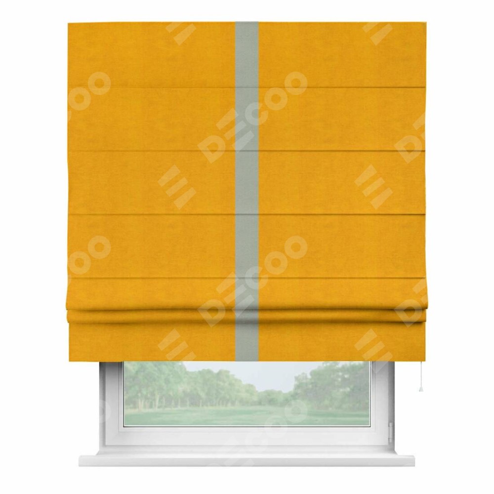 Римская штора производителя «Cortin», используется для проёма, пошита из ткани вельвет желтый, артикул ткани 85547. Отделка шторы кантом «Хайвей», ткань для канта используется из вельвета разной расцветки на выбор. Имеет универсальный механизм и подходит для монтажа: на потолок, на стену и в нишу.