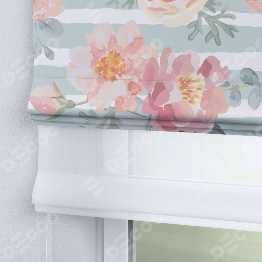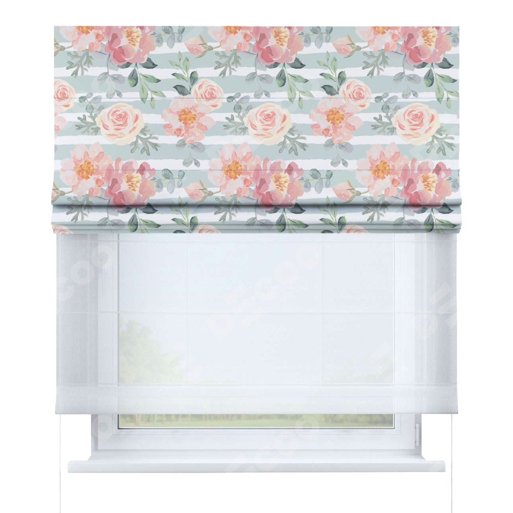 Римская штора день-ночь производителя «Cortin», используется для проёма, пошита из двух полотен, с лицевой блэкаут с нанесением сублимационной печати «Розы акварель», вторая ткань тюль (по стандарту комплектуется тюль белого цвета артикул V-01). Имеет универсальный механизм и подходит для монтажа: на потолок, на стену и в нишу.