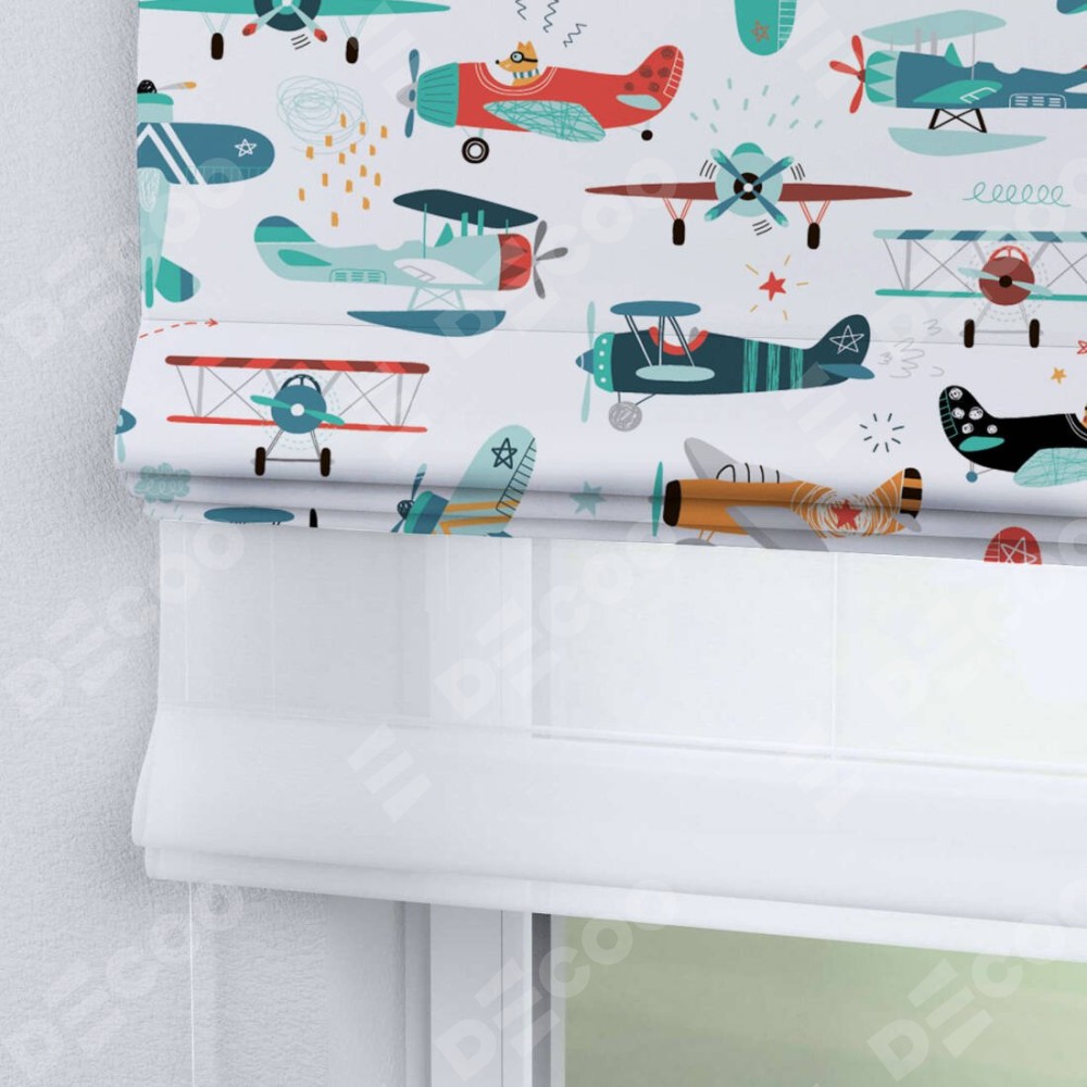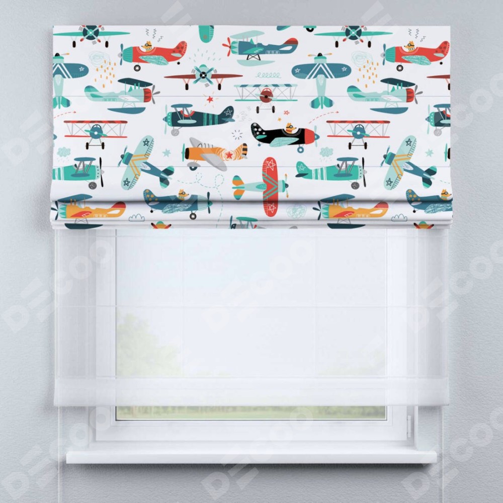 Римская штора день-ночь производителя «Cortin», используется для проёма, пошита из двух полотен, с лицевой блэкаут с нанесением сублимационной печати «Самолёты и пилоты», вторая ткань тюль (по стандарту комплектуется тюль белого цвета артикул V-01). Имеет универсальный механизм и подходит для монтажа: на потолок, на стену и в нишу.